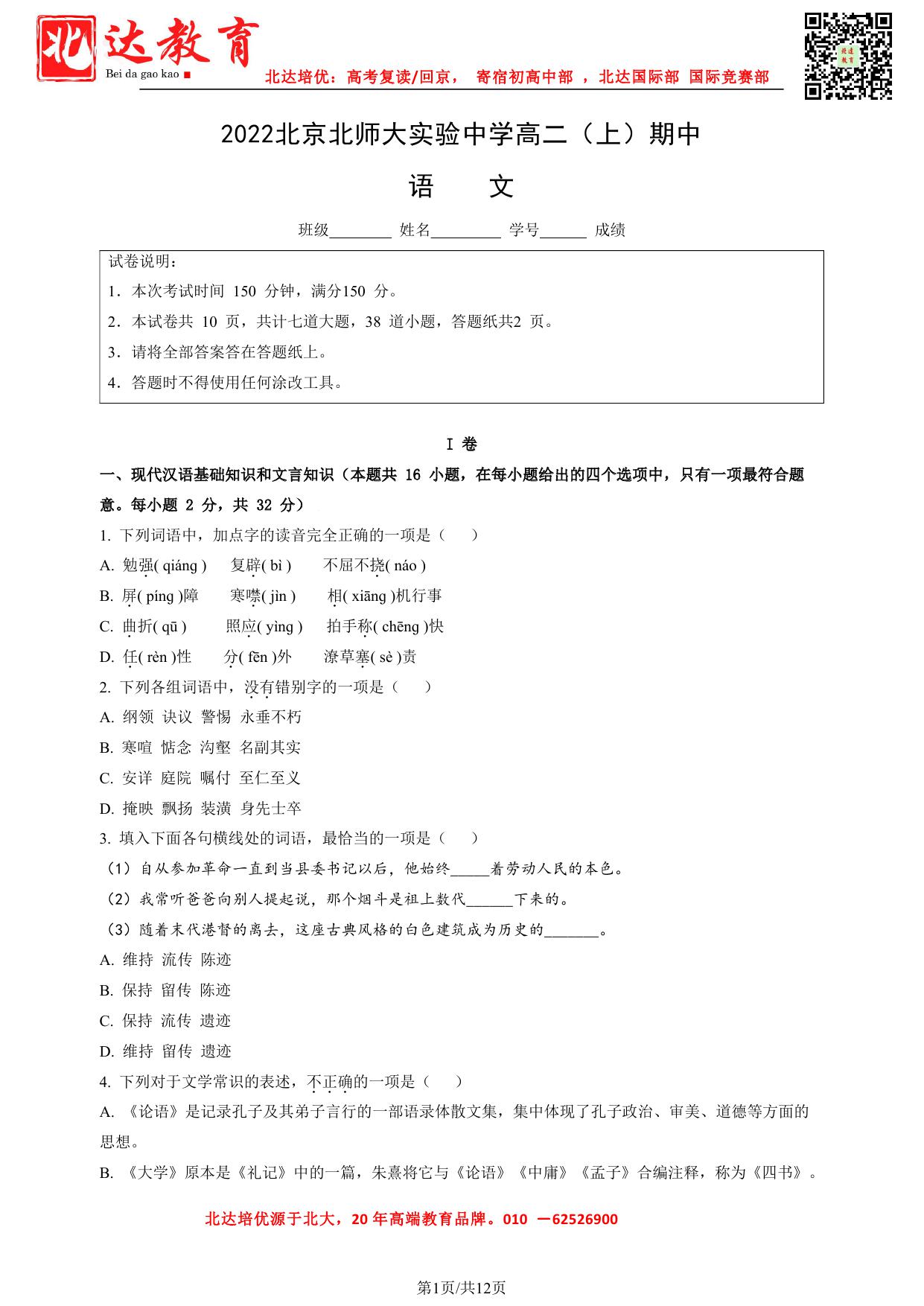 北京admw360教研组收集整理了2022-2023学年北师大高二(上)期中语文试题及答案,一起来看看。