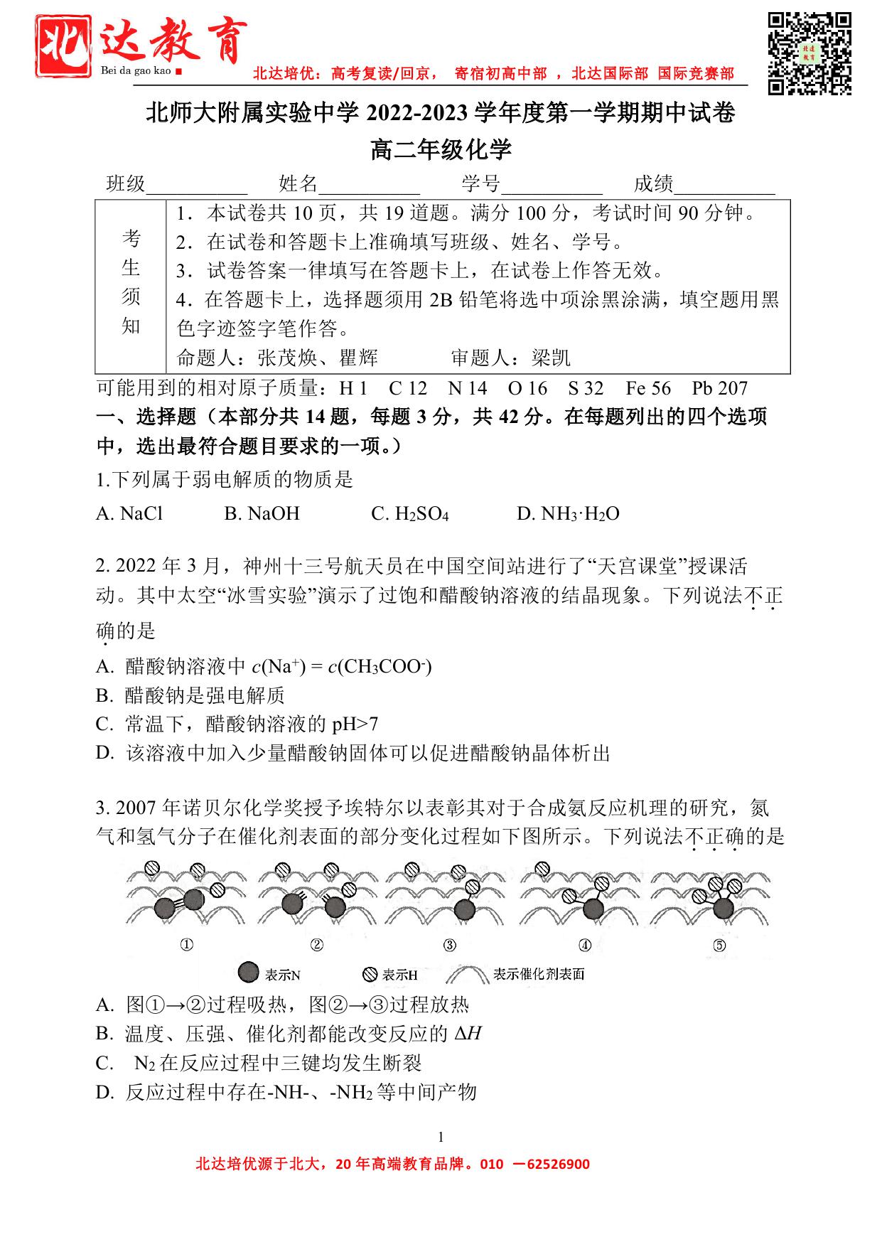 北京admw360教研组收集整理了2022-2023学年北师大实验高二(上)期中化学试题及答案,一起来看看。