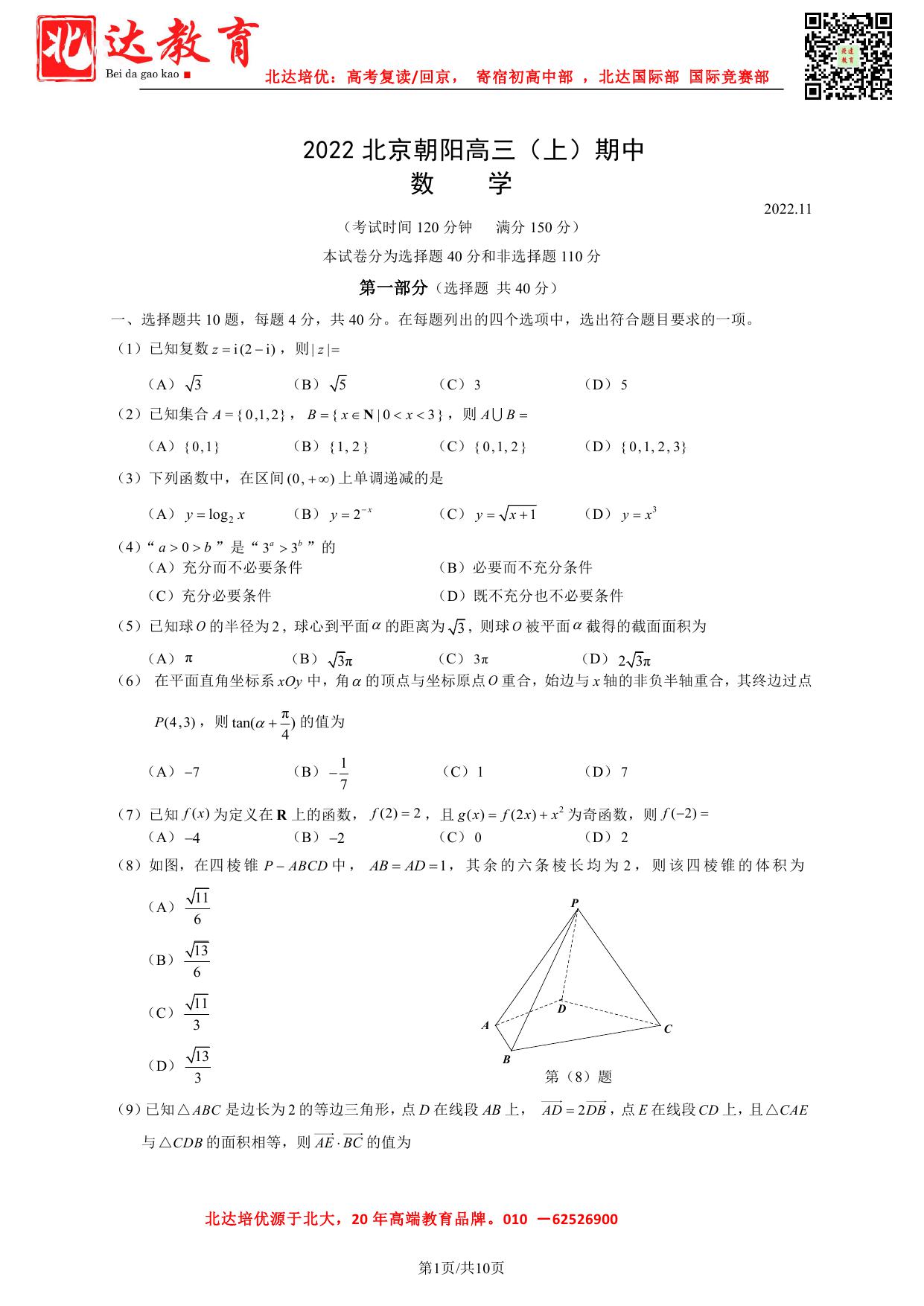 2022-2023学年北京海淀区高三期中考试与11月1日开考,北京admw360教研组收集整理了2022-2023学年北京朝阳区高三第一学期期中数学试题及答案,一起来看看。