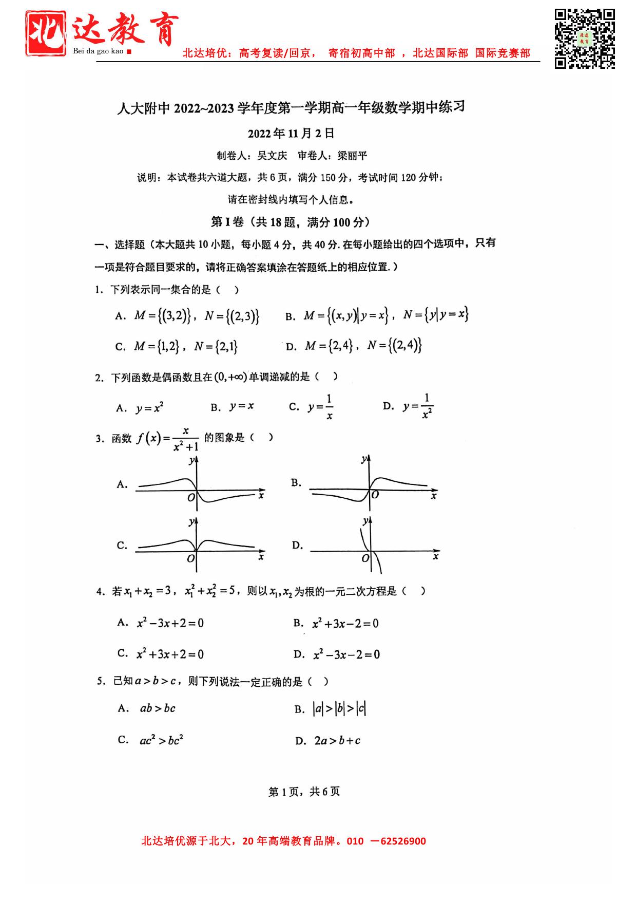北京admw360教研组收集整理了2022-2023学年北京人大附中高一(上)期中数学试题,一起来看看。