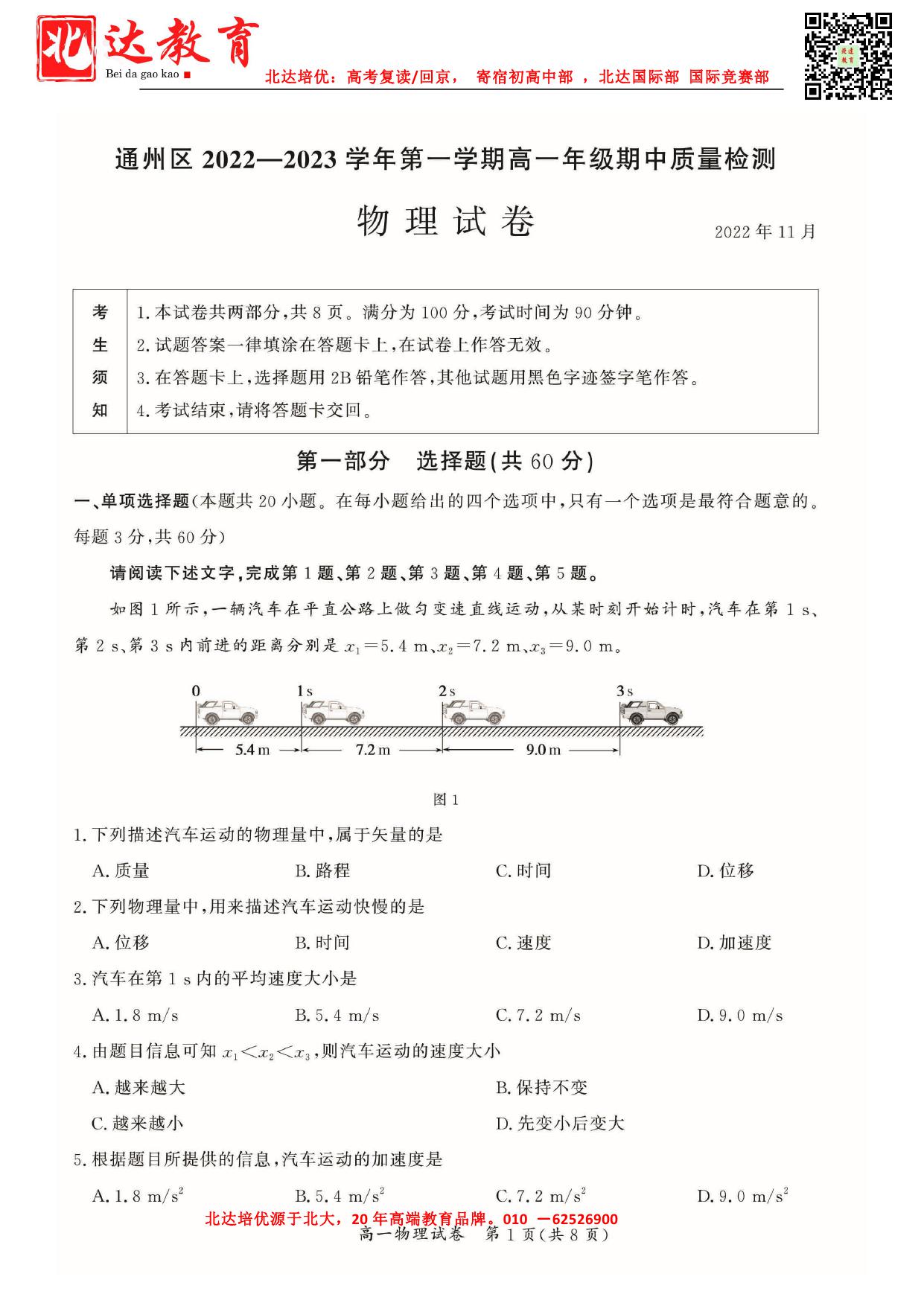 北京admw360教研组收集整理了2022-2023学年北京通州高一(上)期中物理试题,一起来看看。