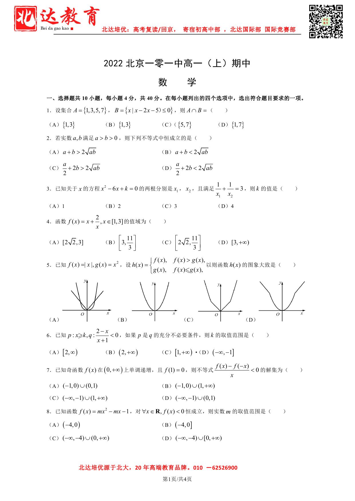 北京admw360教研组收集整理了2022-2023学年北京一零一中高一(上)期中数学试题,一起来看看。