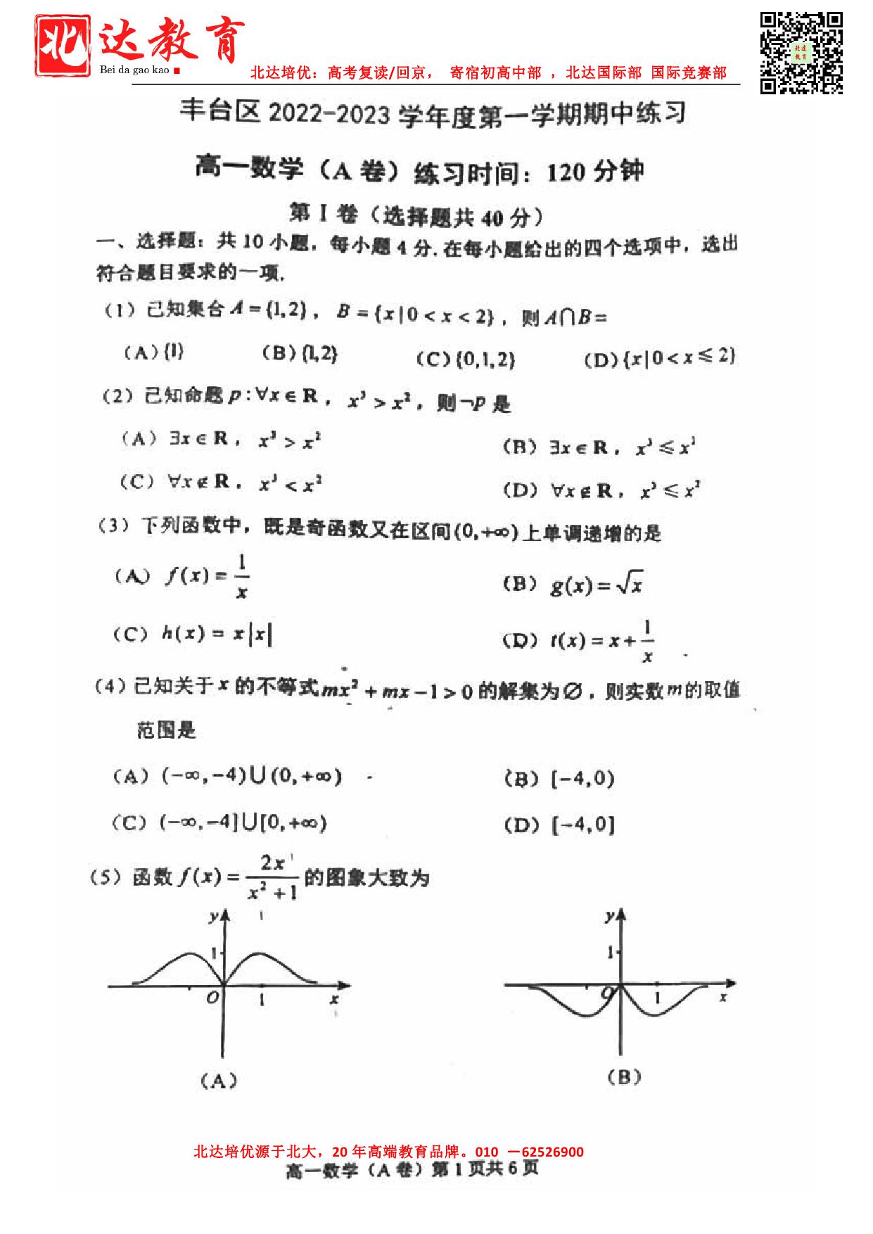北京admw360教研组收集整理了2022-2023学年北京丰台高一(上)期中数学A卷试题及答案,一起来看看。