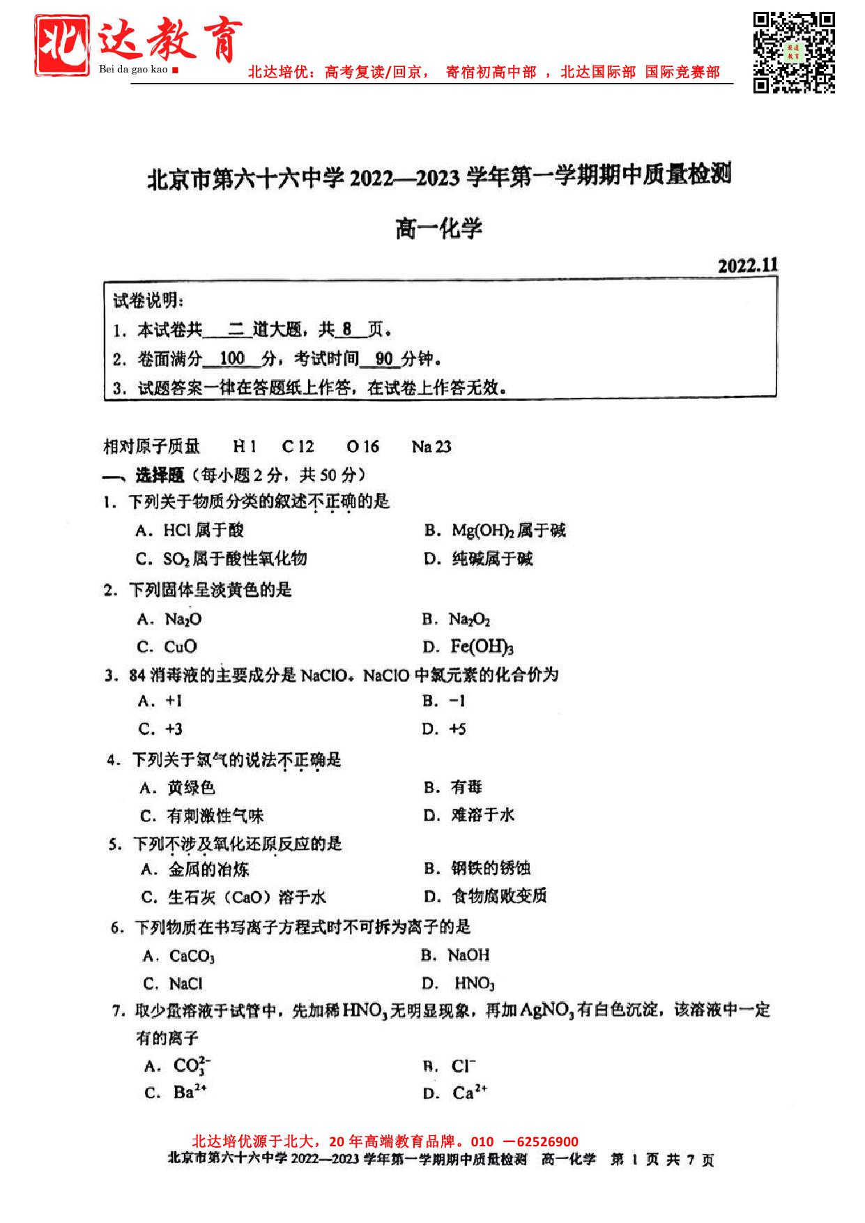 北京admw360教研组收集整理了2022-2023学年北京六十六中高一(上)期中化学试题,一起来看看。
