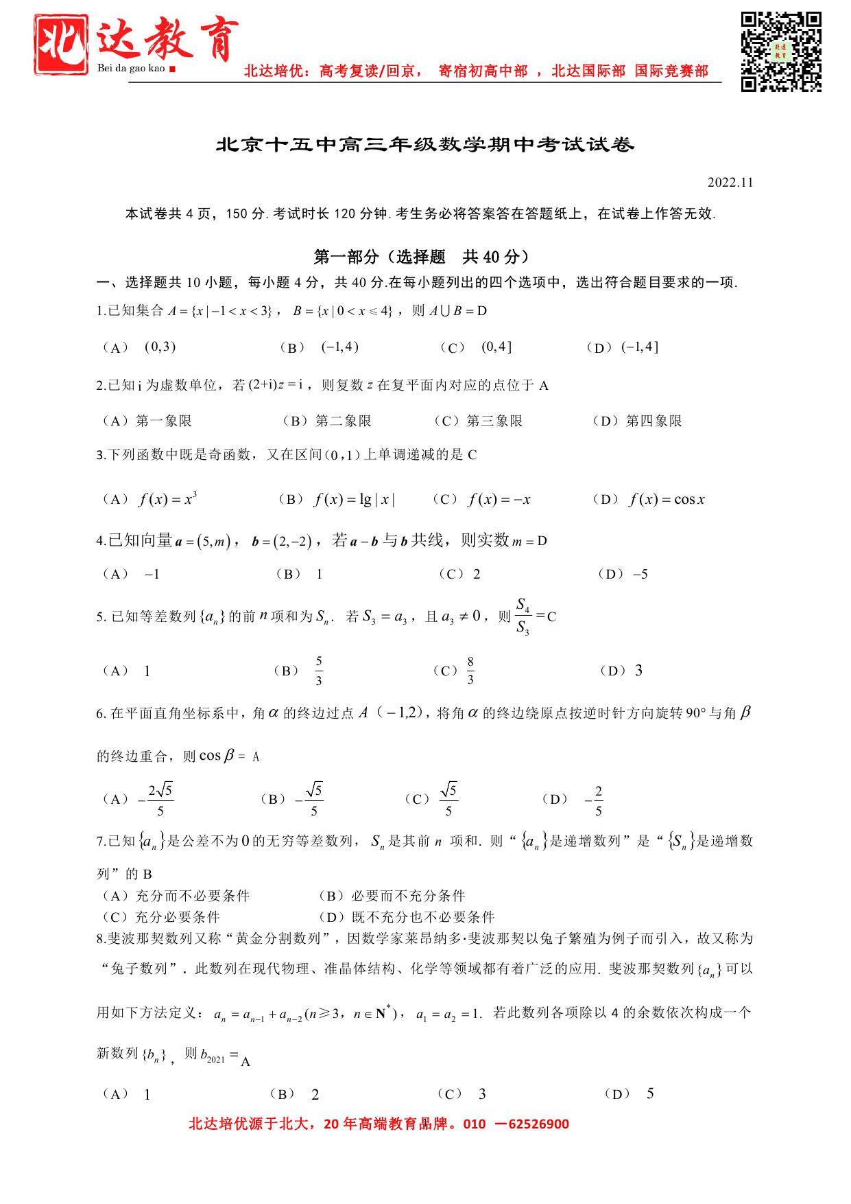 2022-2023学年北京海淀区高三期中考试与11月1日开考,北京admw360教研组收集整理了2022-2023学年北京十五中高三期中数学试题及答案,一起来看看。