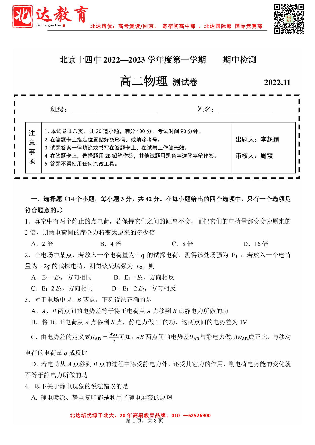 北京admw360教研组收集整理了2022-2023学年北京十四中高二(上)期中物理试题,一起来看看。
