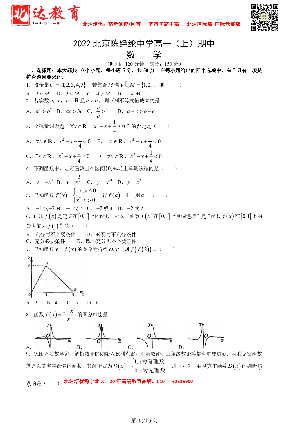 北京admw360教研组为大家整理了2022-2023学年北京陈经纶中学高一(上)期中数学试题及答案,分享给大家,赶紧下载练习起来吧。