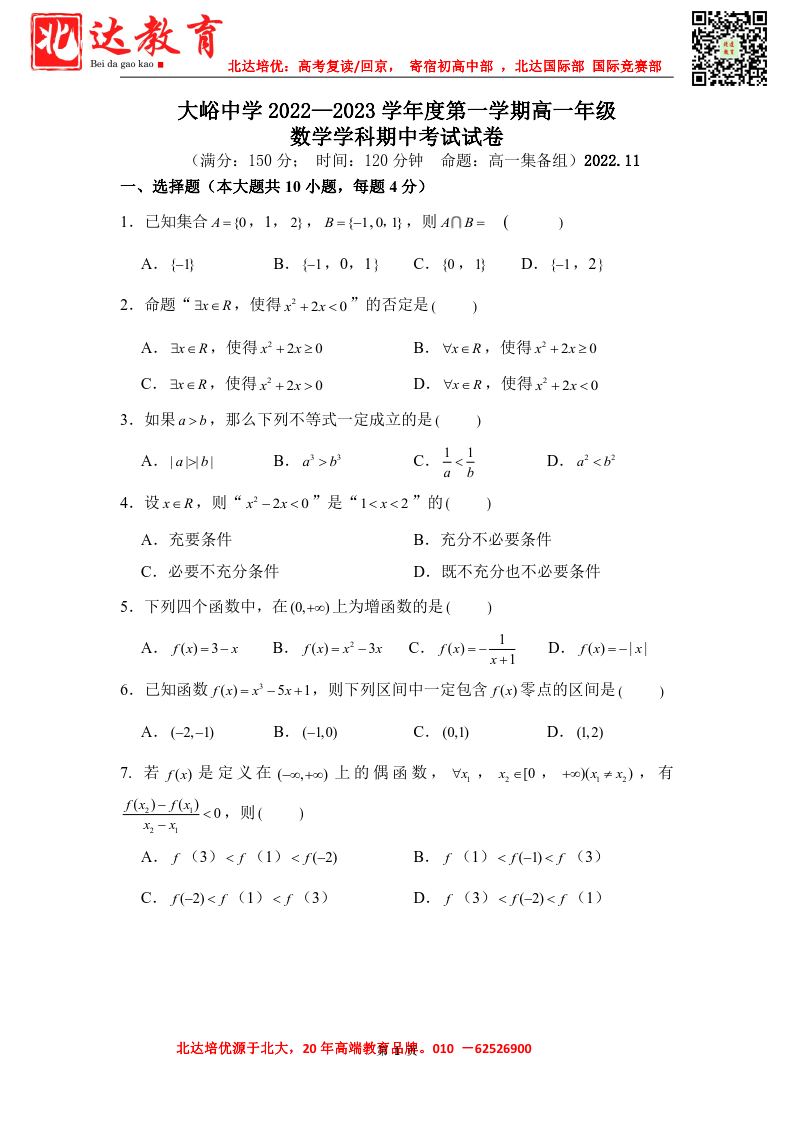 北京admw360教研组为大家整理了2022-2023学年北京大峪中学高一(上)期中数学试题,分享给大家,赶紧下载练习起来吧。