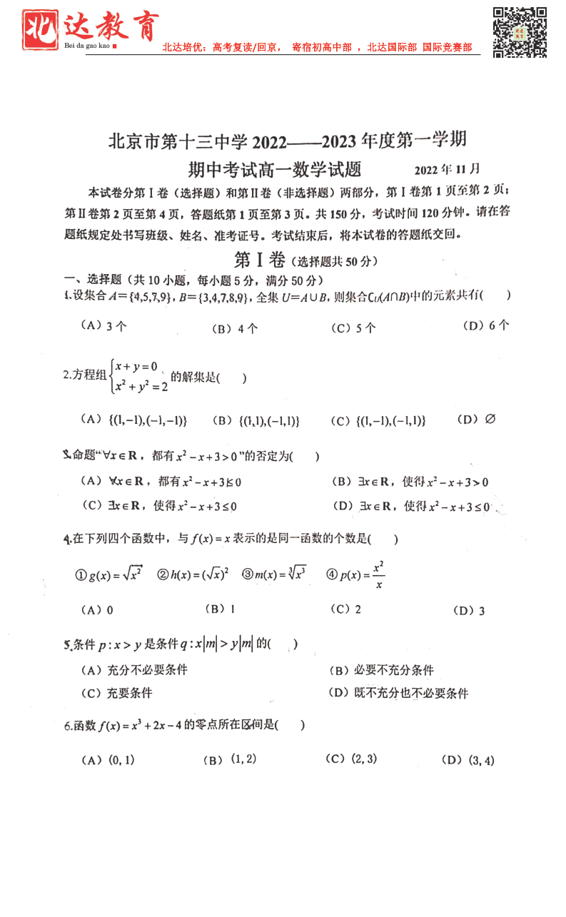 北京admw360教研组为大家整理了2022-2023学年北京第十三中学高一(上)期中数学试题,分享给大家,赶紧下载练习起来吧。