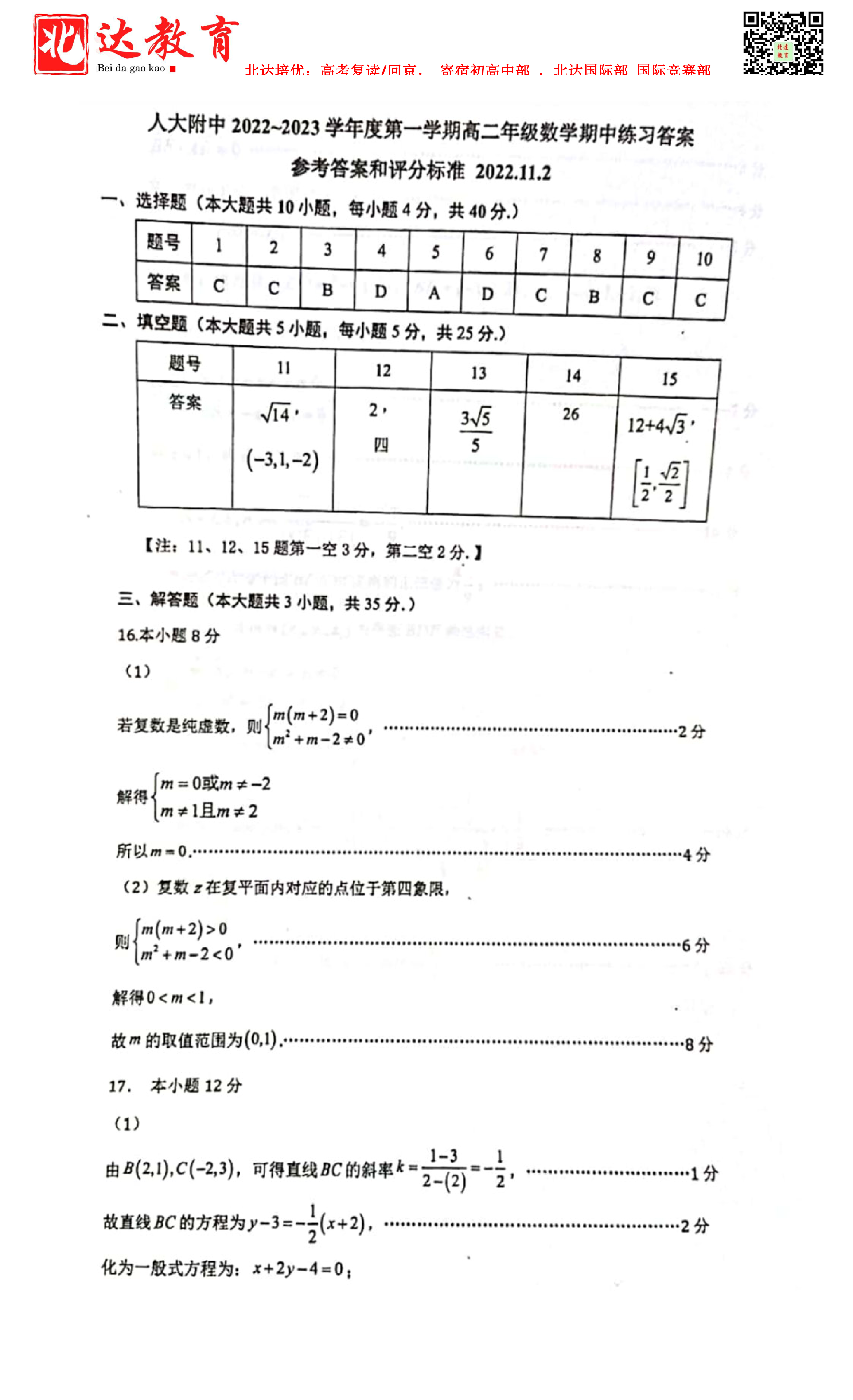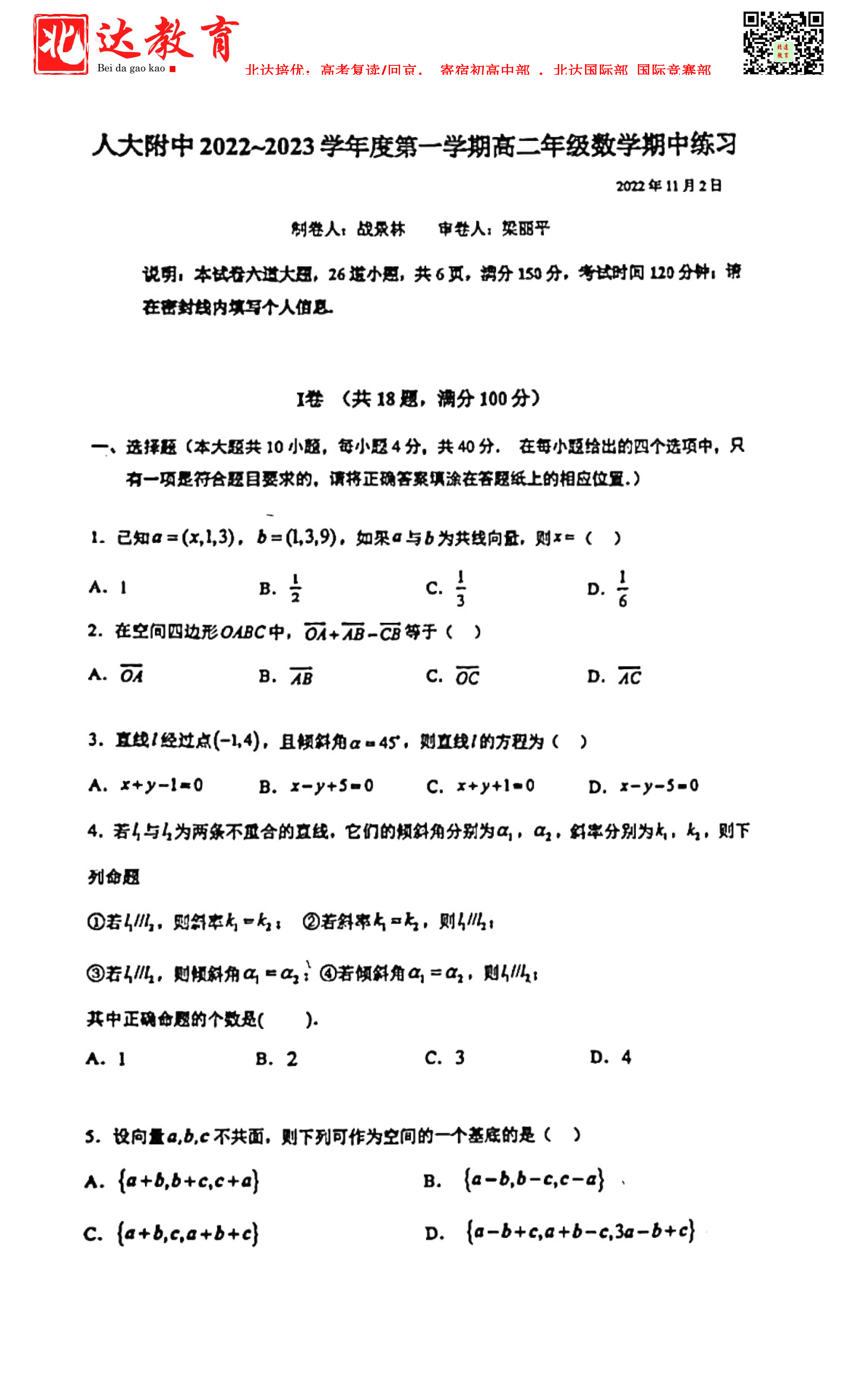 北京admw360教研组为大家整理了2022-2023学年人大附中高二(上)数学期中试题及答案,分享给大家,赶紧下载练习起来吧。