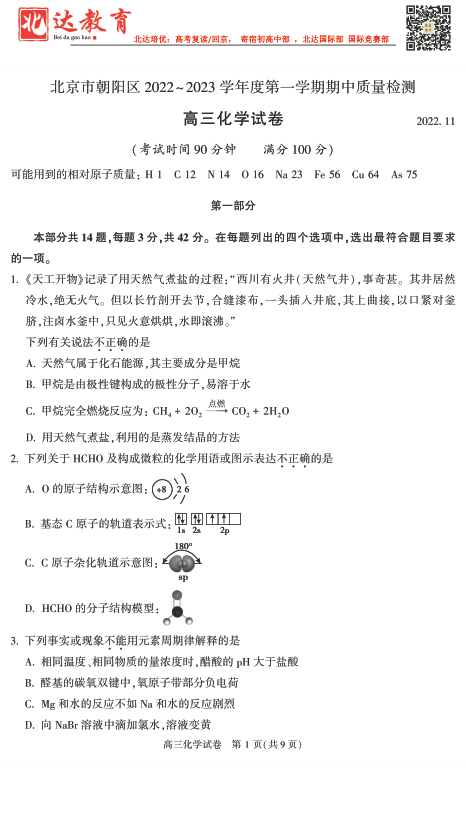 北京admw360教研组为大家整理了2022-2023学年北京朝阳区高三(上)化学期中试题及答案,分享给大家,赶紧下载练习起来吧。
