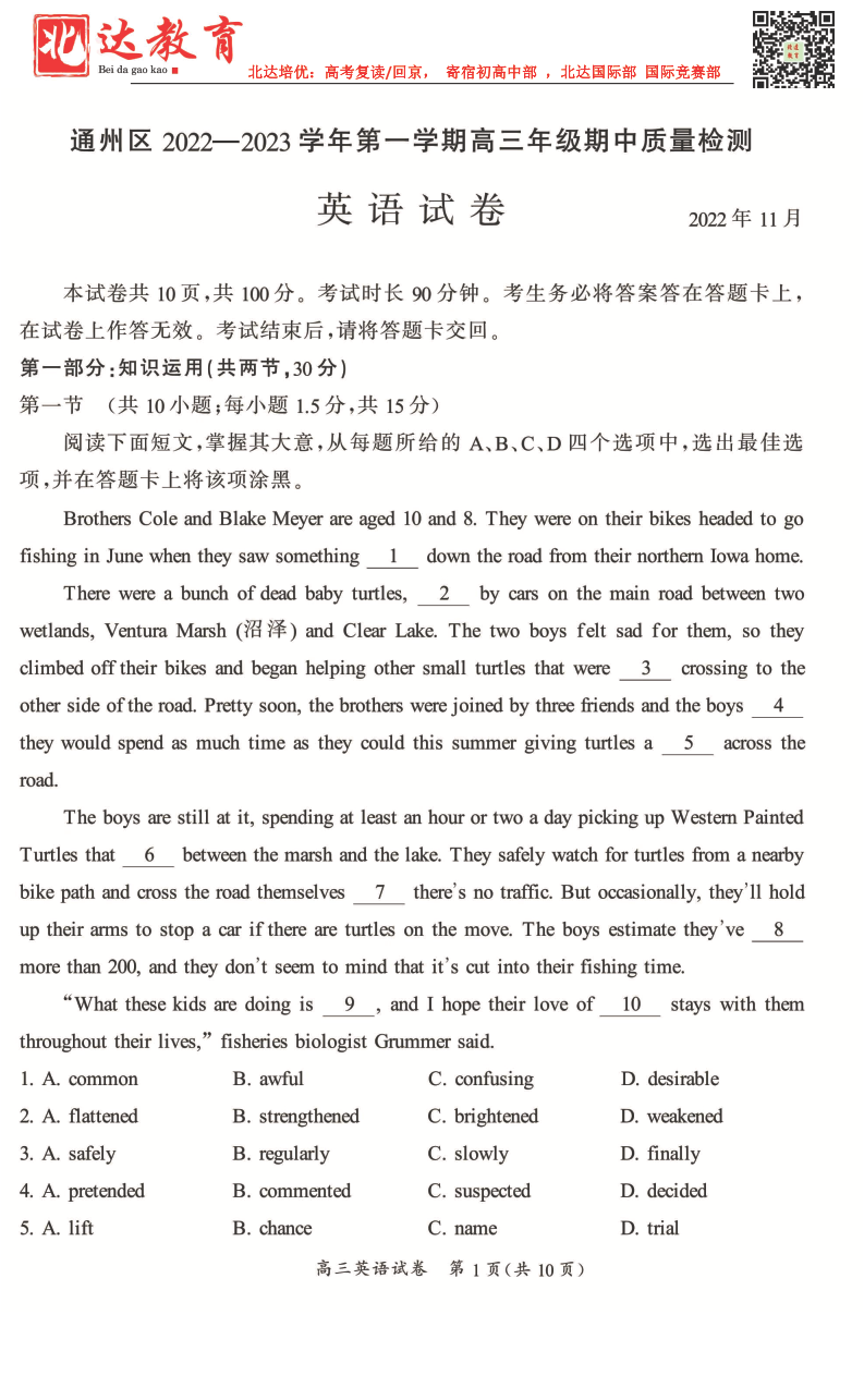 北京admw360教研组为大家整理了2022-2023学年北京通州区高三(上)英语期中试题,分享给大家,赶紧下载练习起来吧。