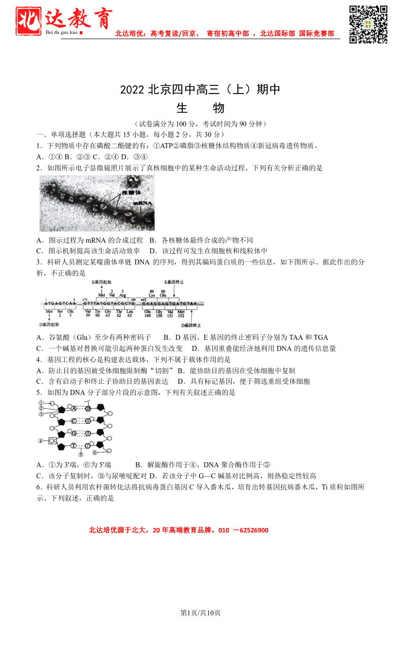 北京admw360教研组为大家整理了2022-2023学年北京四中高三上期中生物试题及答案,分享给大家,赶紧下载练习起来吧。