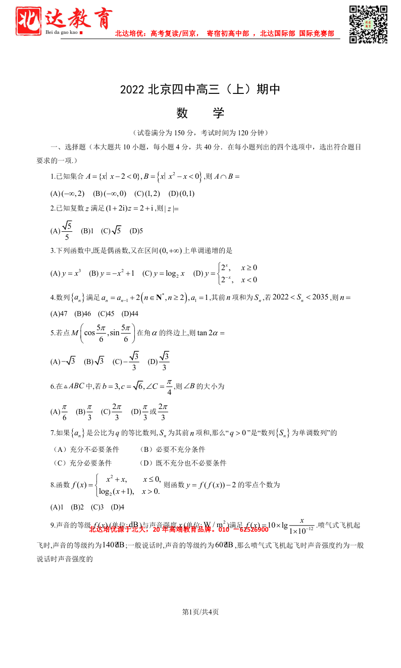 北京admw360教研组为大家整理了2022-2023学年北京四中高三上期中数学试题,分享给大家,赶紧下载练习起来吧。