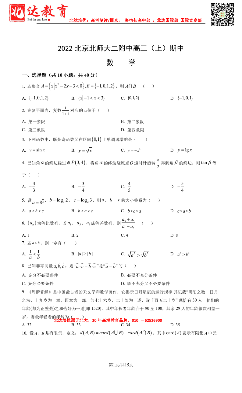 北京admw360教研组为大家整理了2022-2023学年北师大二附中高三上期中数学试题及答案,分享给大家,赶紧下载练习起来吧。