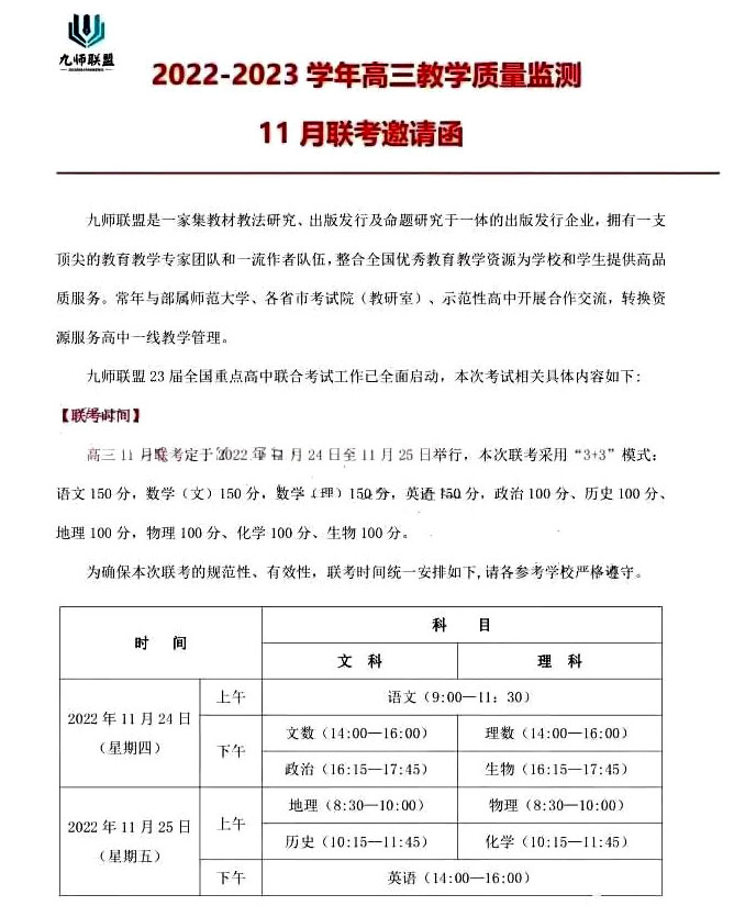 admw360高考网为大家整理了2023九师联盟高三11月联考各科目考试时间安排。快一起来看看吧!
