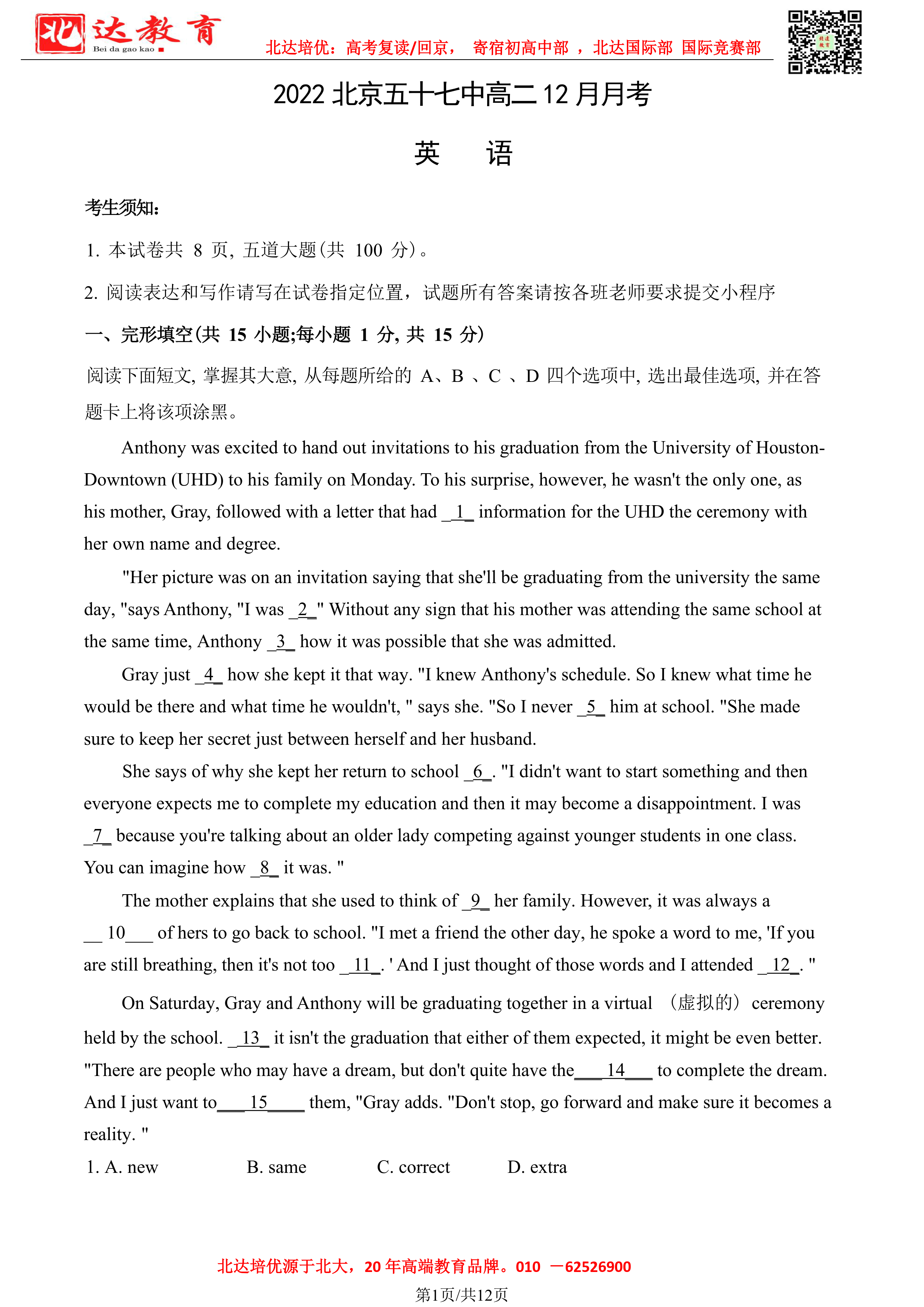 12月开始,北京市各区高中年级将陆续开展12月月考。admw360高考复读学校教研组整理了2023北京五十七中高二12月月考英语试题,附电子版可下载!