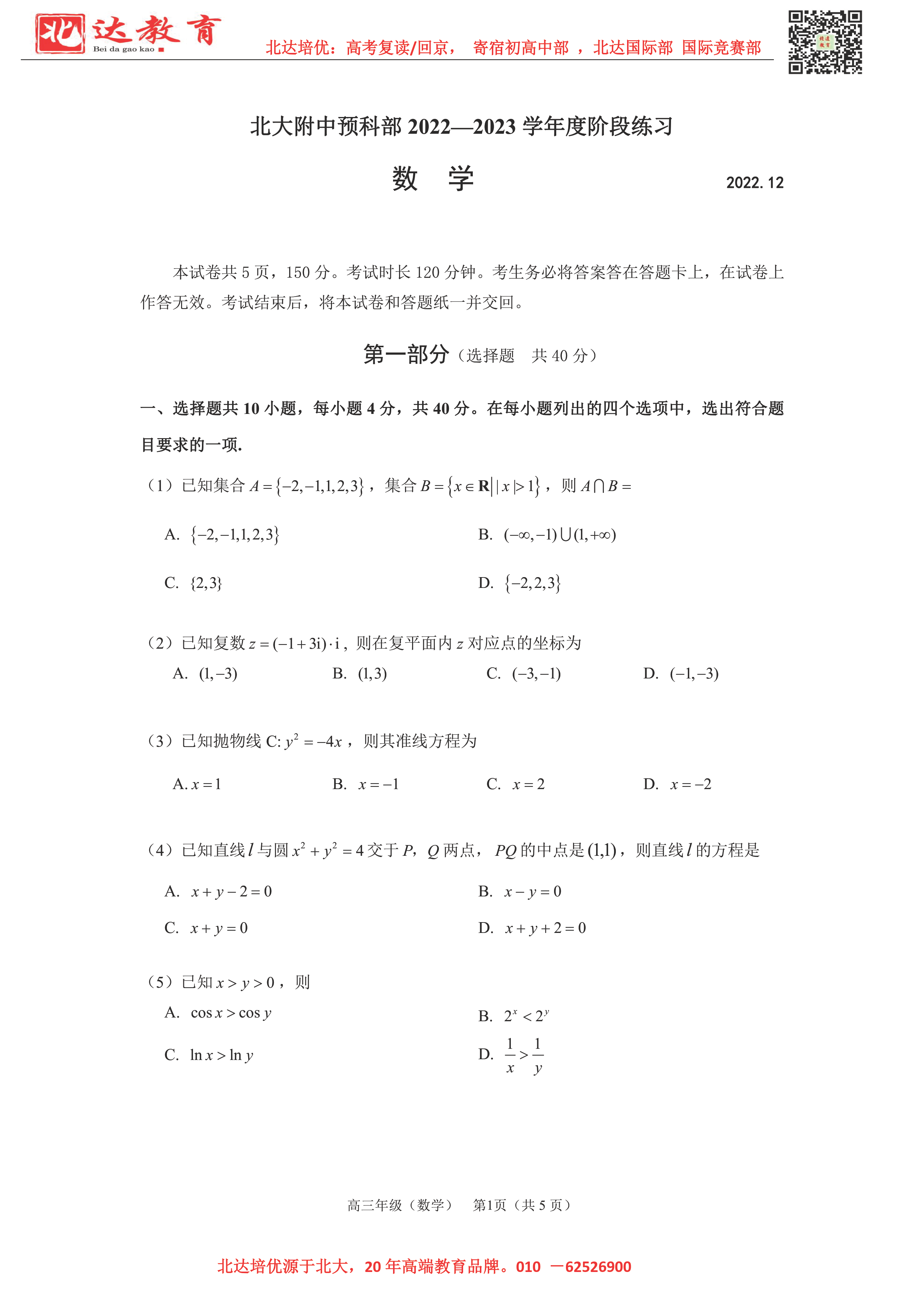 12月开始,北京市各区高中年级将陆续开展12月月考。admw360高考复读学校教研组整理了2022北大附中(预科部)高三12月月考数学试题,附电子版可下载!