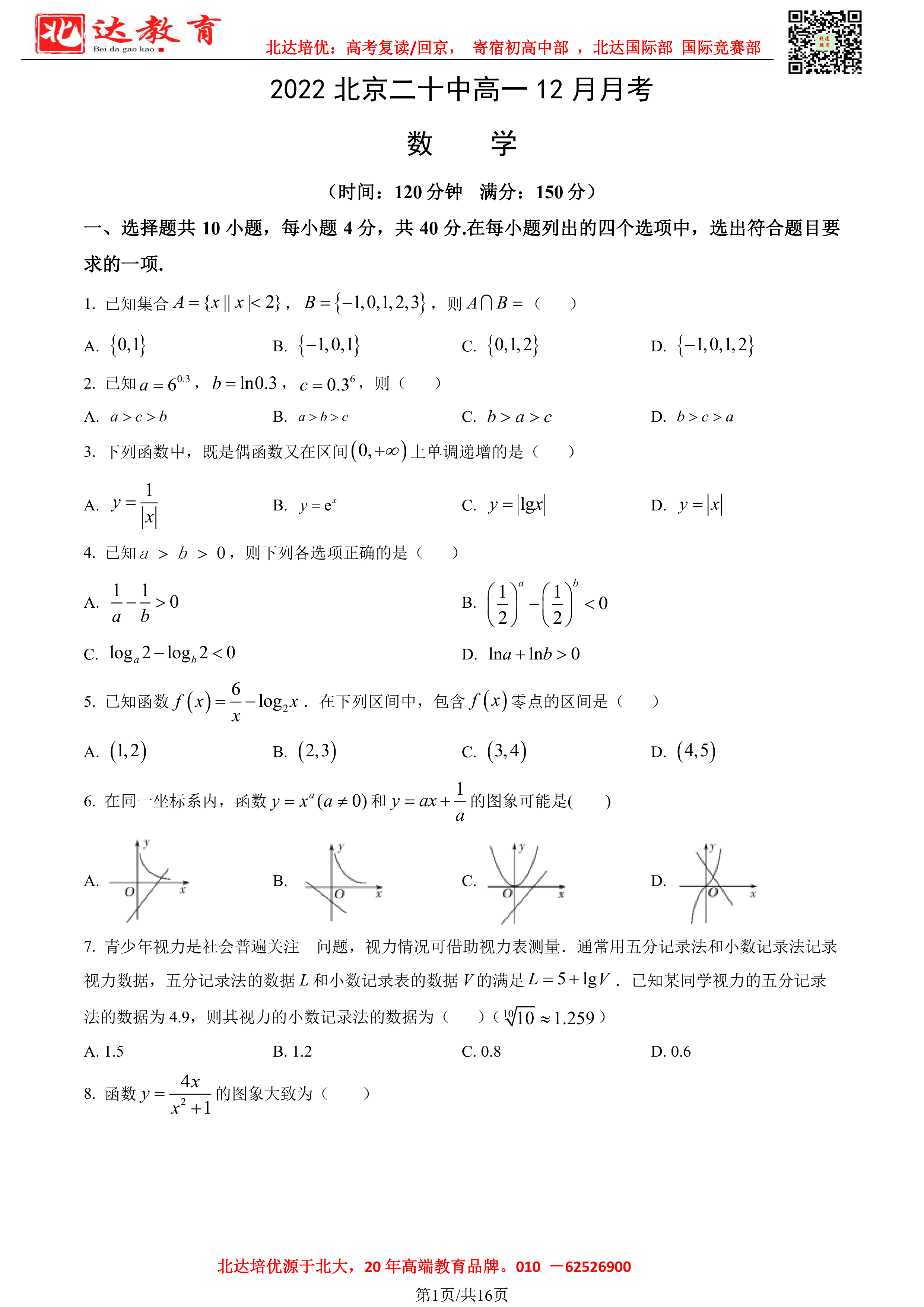 12月开始,北京市各区高中年级将陆续开展12月月考。admw360高考复读学校教研组整理了2022北京二十中高一12月月考数学试题及答案,附电子版可下载!