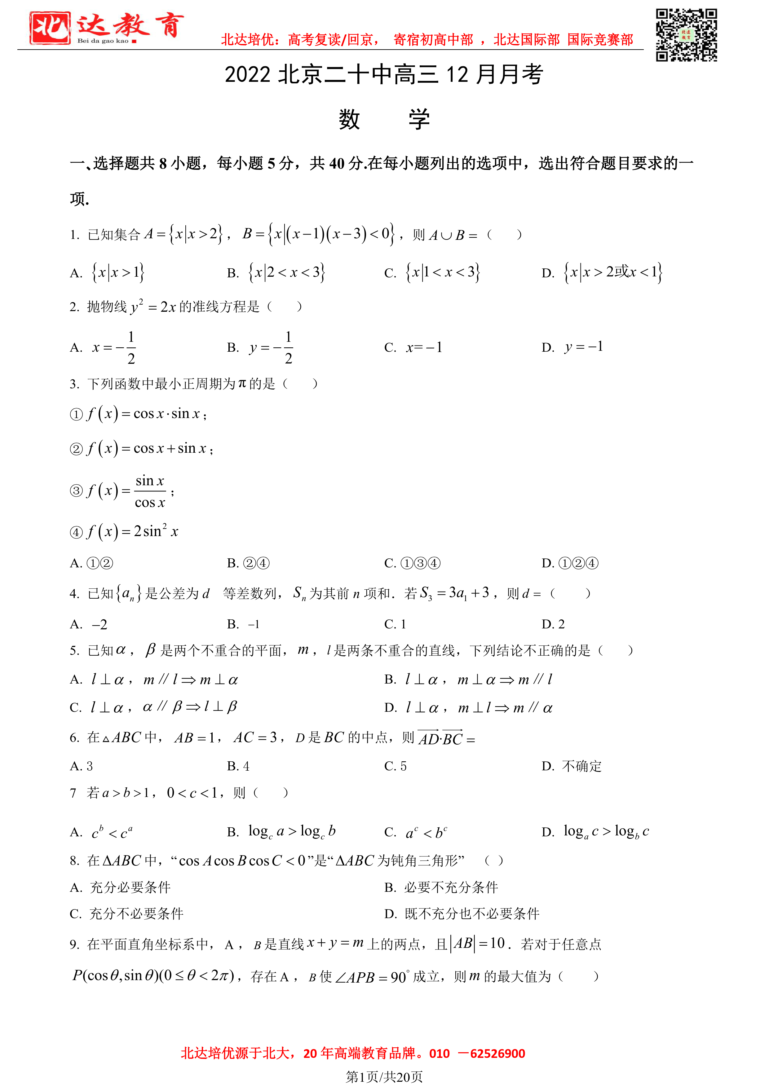 12月开始,北京市各区高中年级将陆续开展12月月考。admw360高考复读学校教研组整理了2022北京二十中高三12月月考数学试题及答案,附电子版可下载!