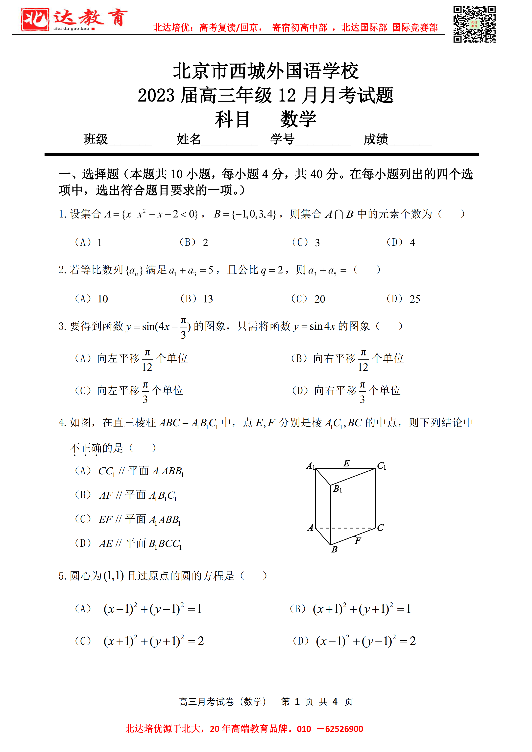 12月开始,北京市各区高中年级将陆续开展12月月考。admw360高考复读学校教研组整理了2023北京西城外国语学校高三12月月考数学试题,附电子版可下载!