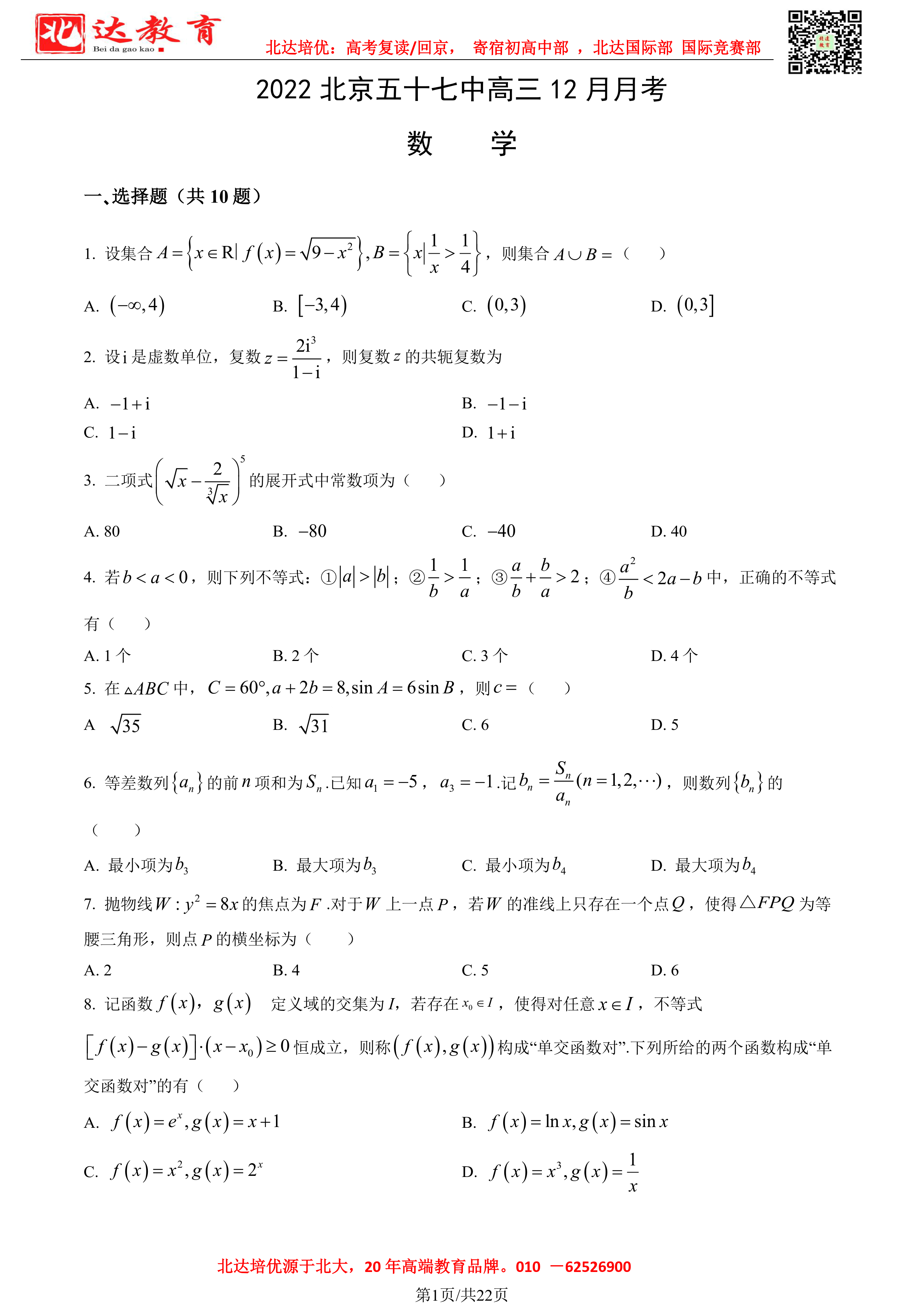 12月开始,北京市各区高中年级将陆续开展12月月考。admw360高考复读学校教研组整理了2023北京五十七中高三12月月考数学试题及答案,附电子版可下载!