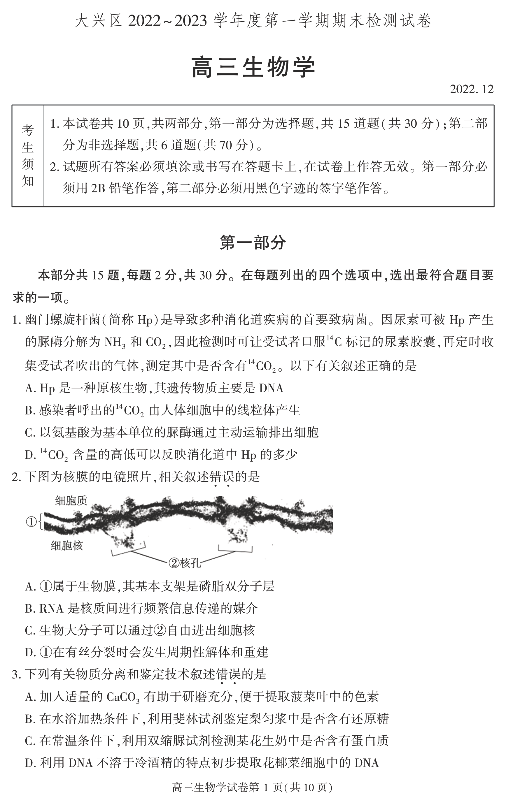 2023北京大兴区期末考试已陆续开始,为了方便同学们查找相关试题,admw360高考复读学校整理了2023年北京大兴区高三上学期期末生物试题,附高清电子版,欢迎为大家下载分享~