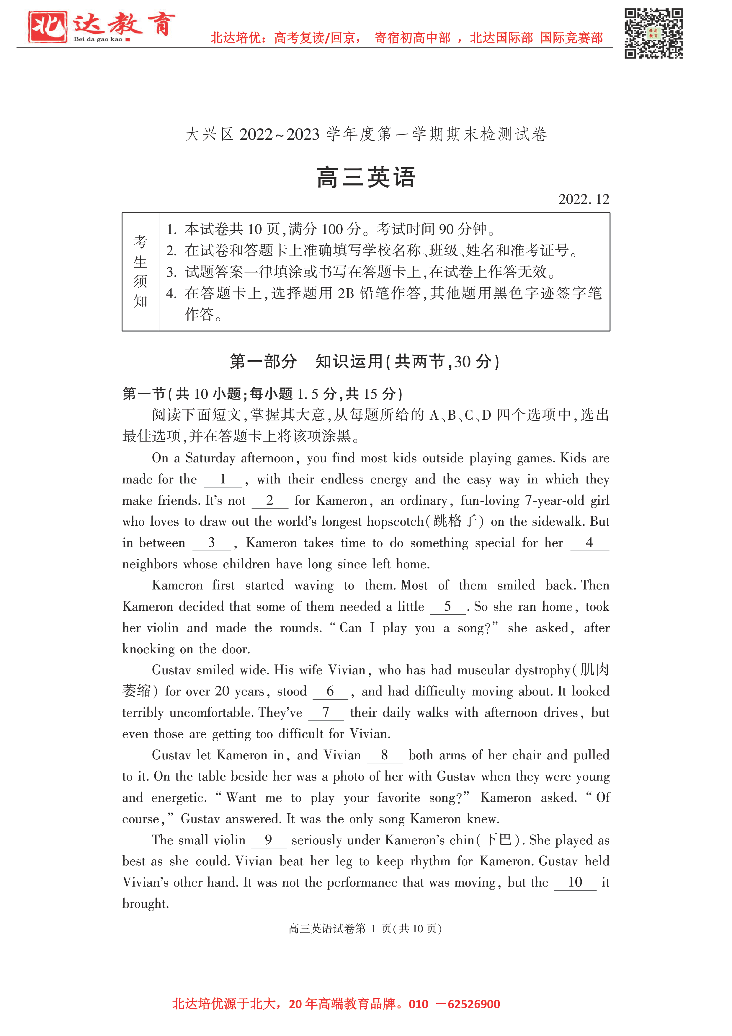 首页 高三资料 2023年北京大兴区高三上学期期末英语试题及答案