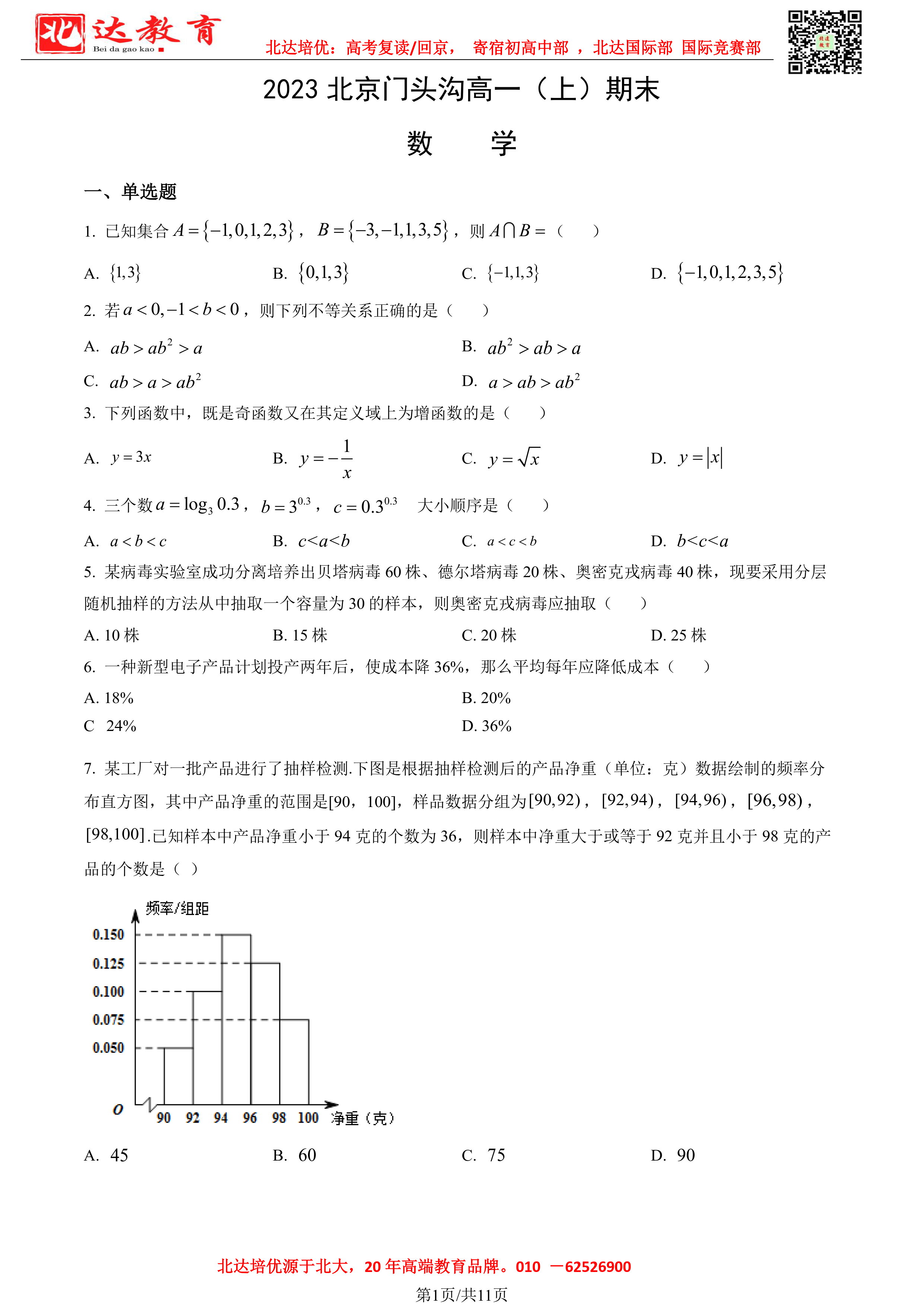 2023北京门头沟区期末考试已陆续开始,为了方便同学们查找相关试题,admw360高考复读学校整理了2023年北京市门头沟区高一上学期期末数学试题及答案,附高清电子版,欢迎为大家下载分享~
