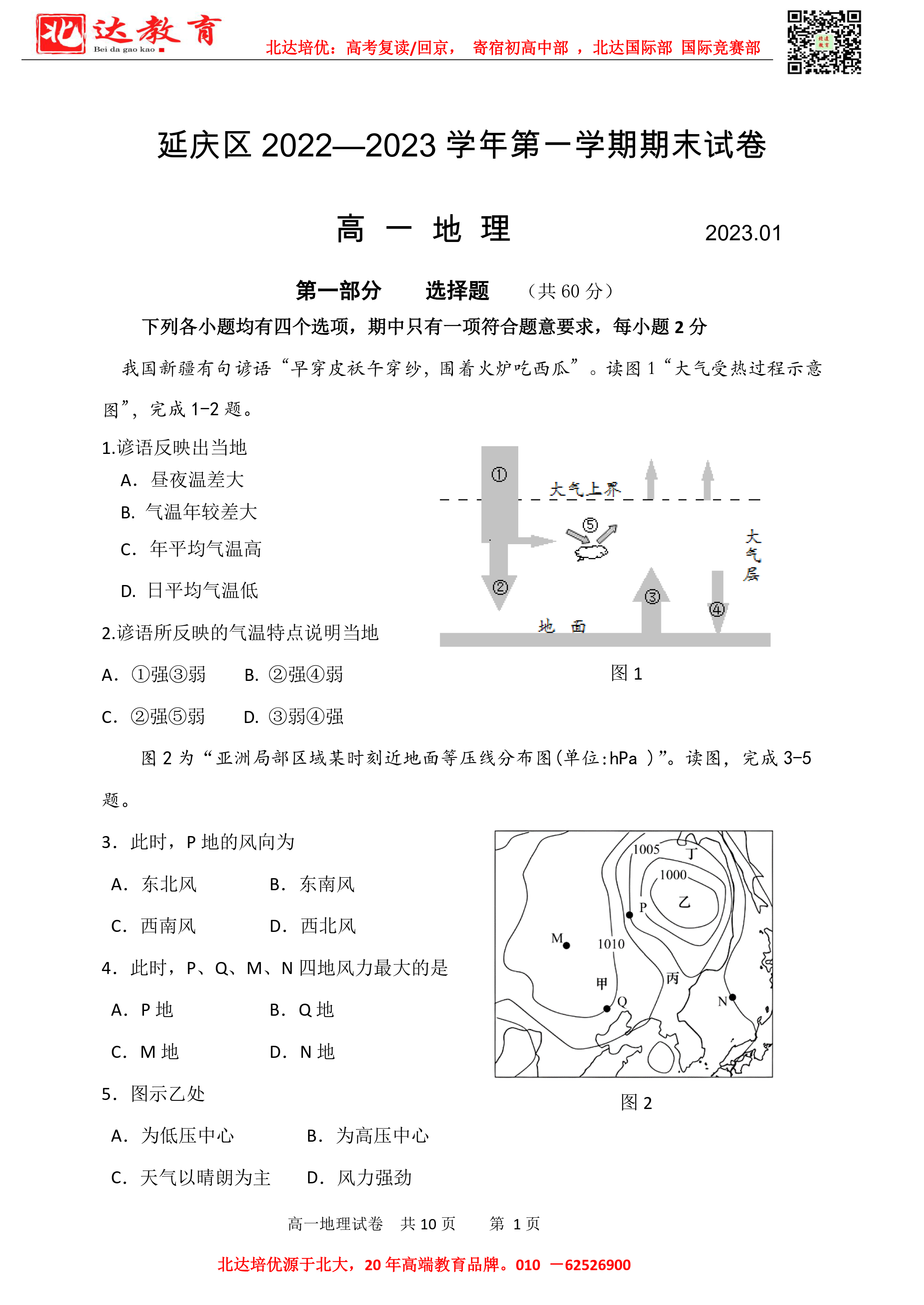 2023北京延庆区期末考试已陆续开始,为了方便同学们查找相关试题,admw360高考复读学校整理了2023年北京市延庆区高一上学期期末地理试题及答案,附高清电子版,欢迎为大家下载分享~