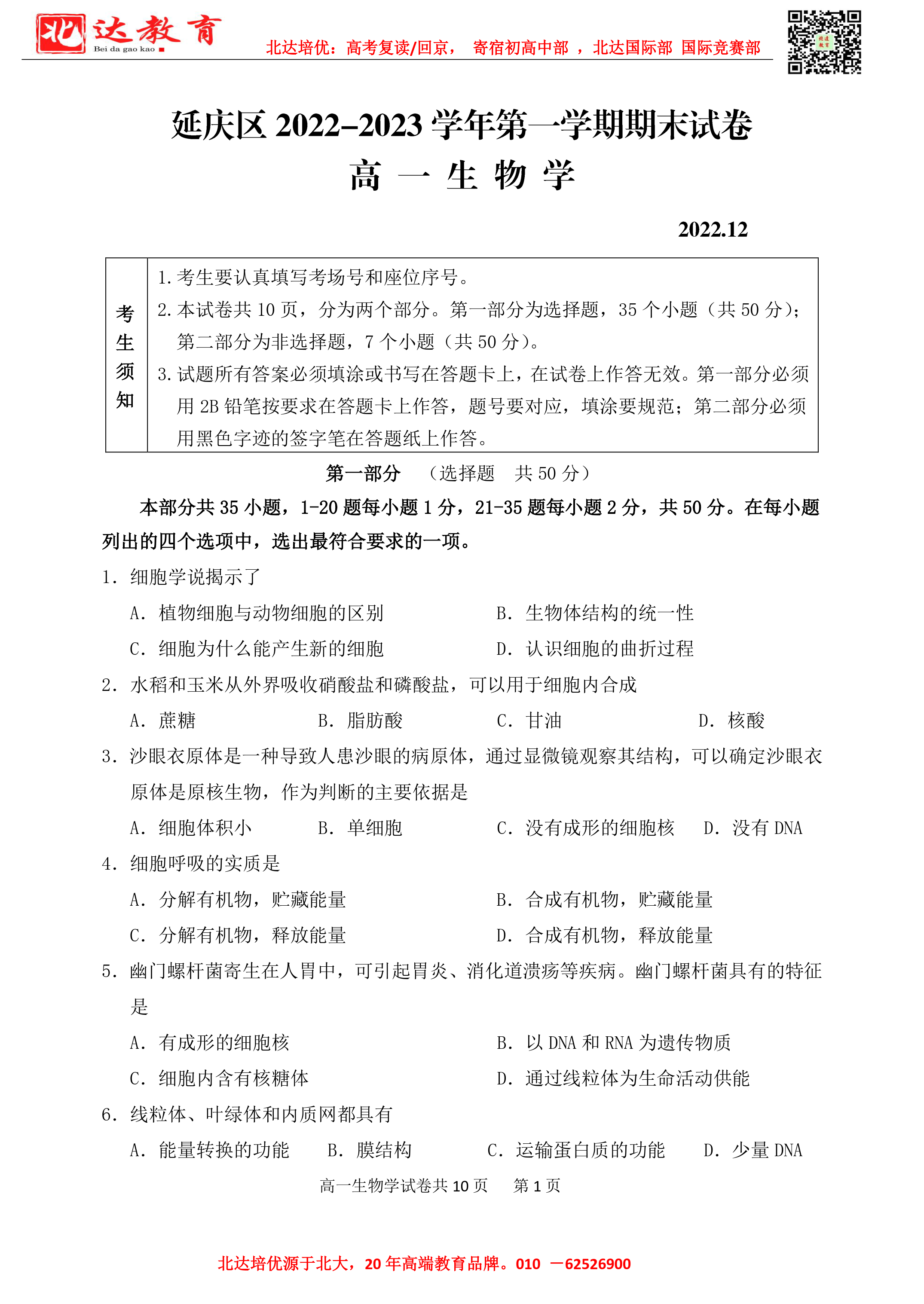 2023北京延庆区期末考试已陆续开始,为了方便同学们查找相关试题,admw360高考复读学校整理了2023年北京市延庆区高一上学期期末生物试题及答案,附高清电子版,欢迎为大家下载分享~