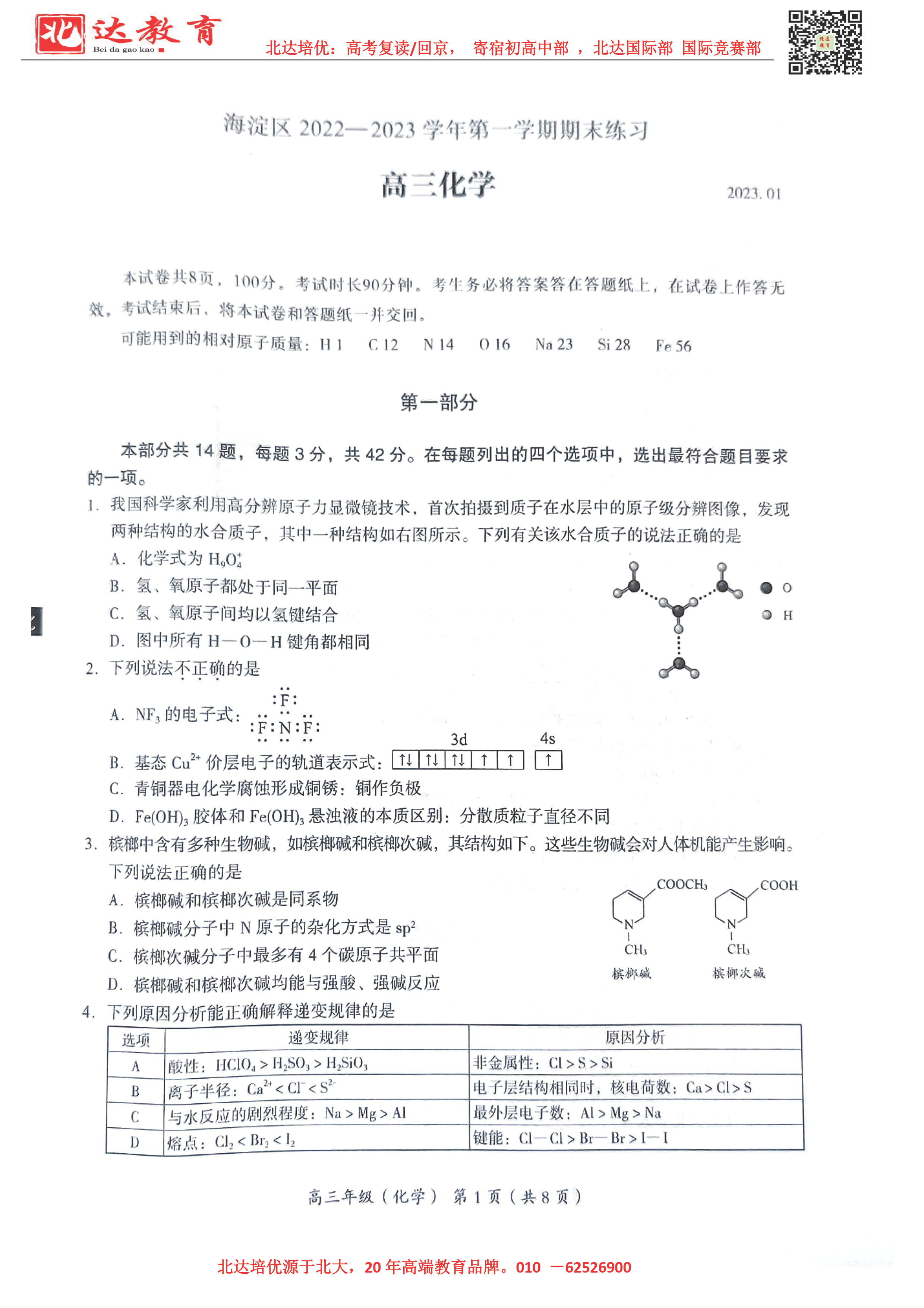 2023北京海淀区期末考试已陆续开始,为了方便同学们查找相关试题,admw360高考复读学校整理了2023年北京海淀区高三上学期期末化学试题,附高清电子版,欢迎为大家下载分享~