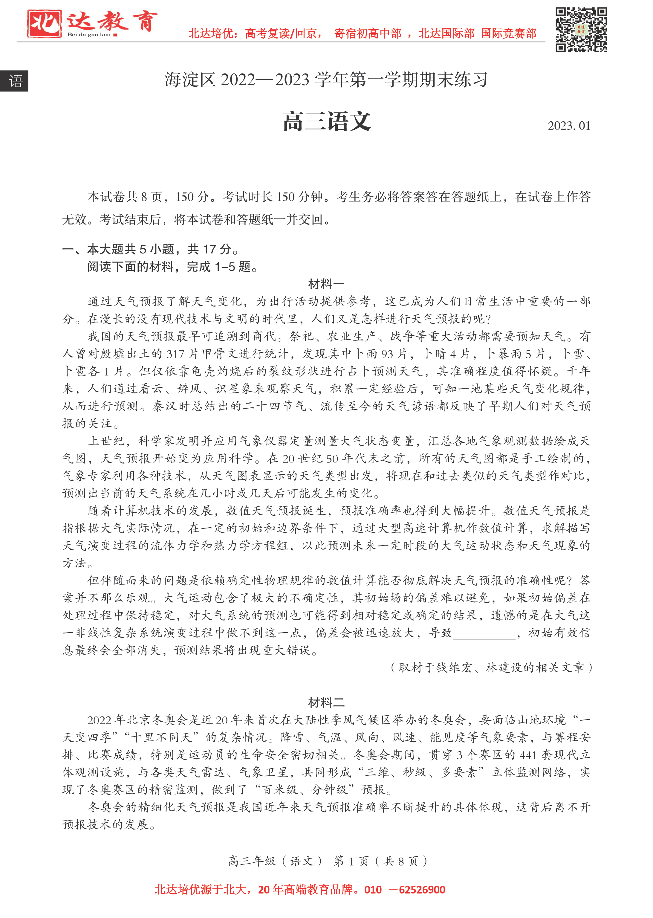 2023北京海淀区期末考试已陆续开始,为了方便同学们查找相关试题,admw360高考复读学校整理了2023年北京海淀区高三上学期期末语文试题,附高清电子版,欢迎为大家下载分享~ admw360高中部:…