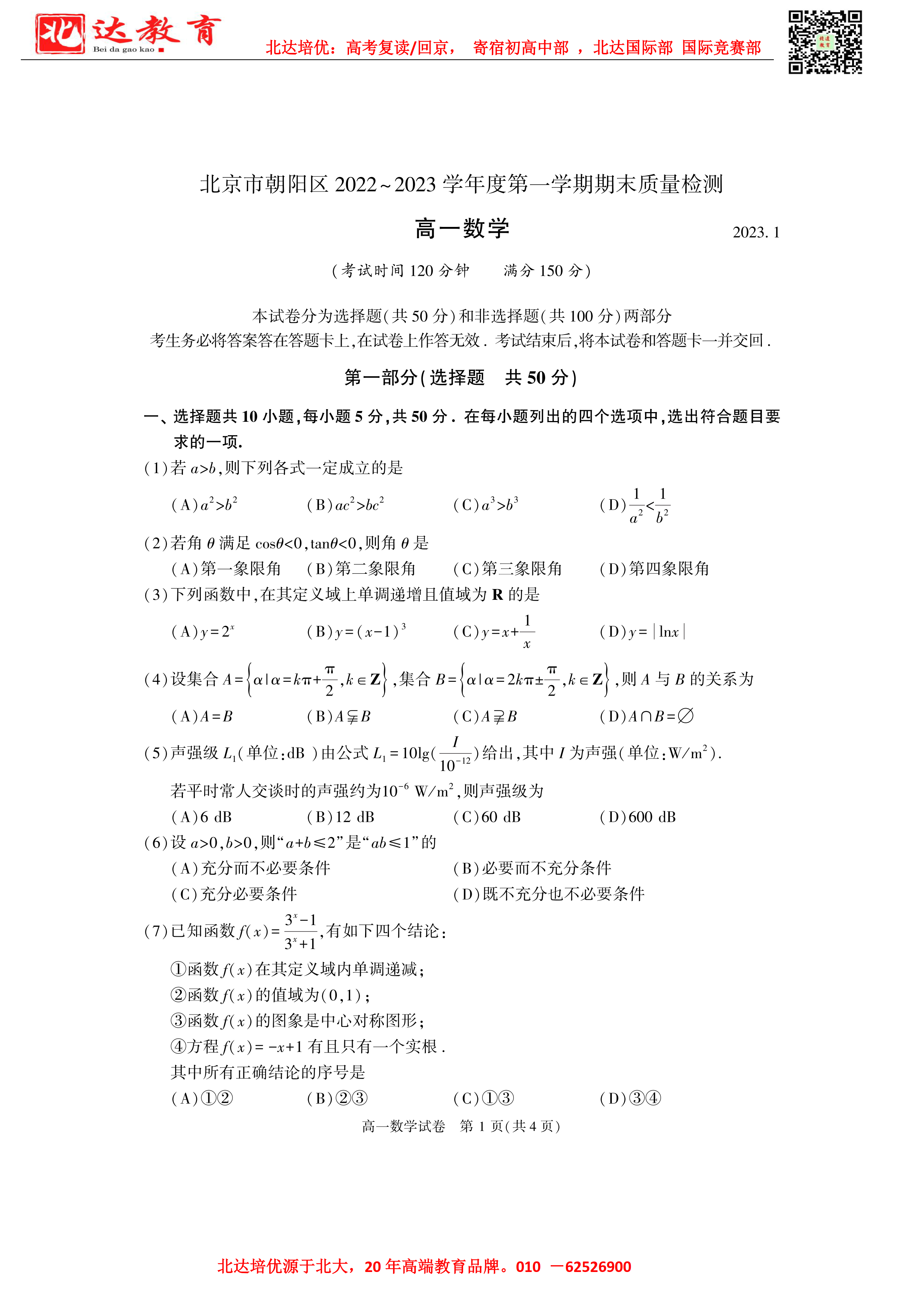 2023年北京朝阳区高一上学期期末数学试题及答案,附高清电子版,欢迎为大家下载分享~