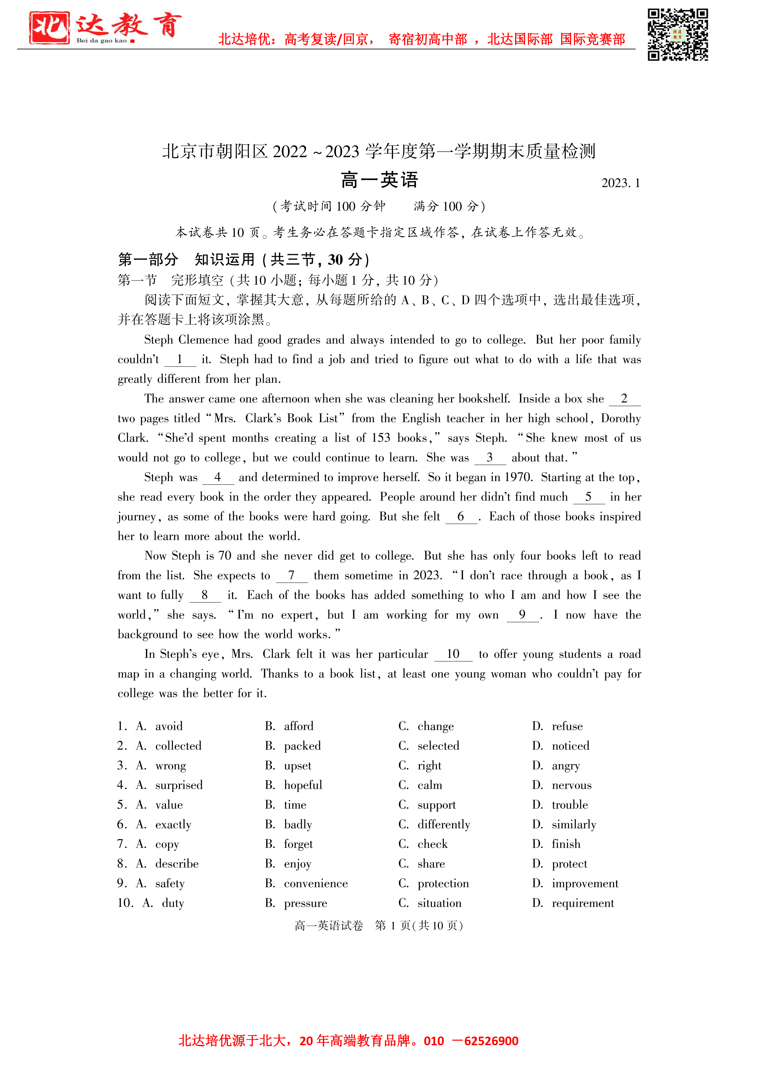 2023年北京朝阳区高一上学期期末英语试题,附高清电子版,欢迎为大家下载分享~
