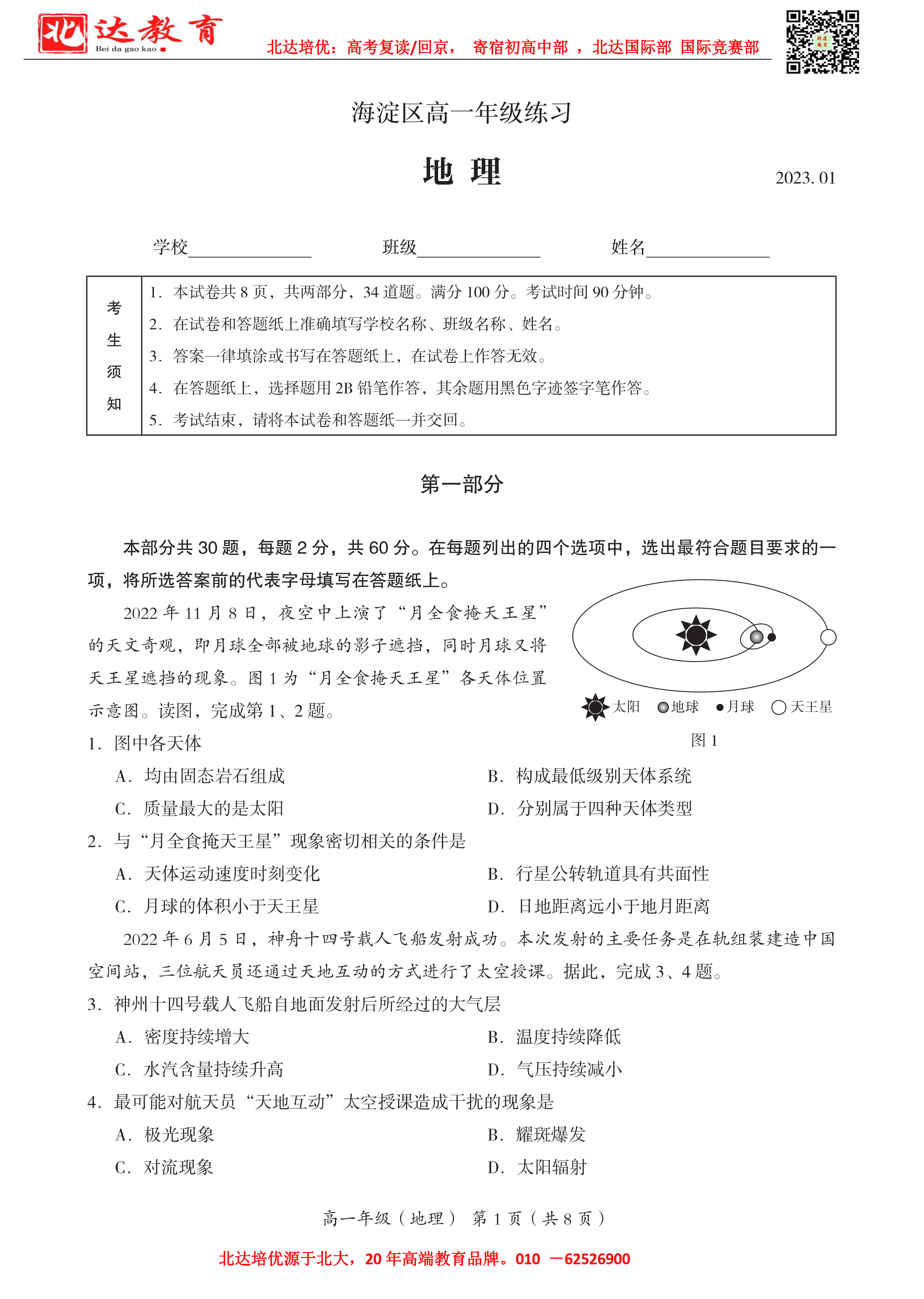 2023年北京海淀区高一上学期期末地理试题及答案,附高清电子版,欢迎为大家下载分享~