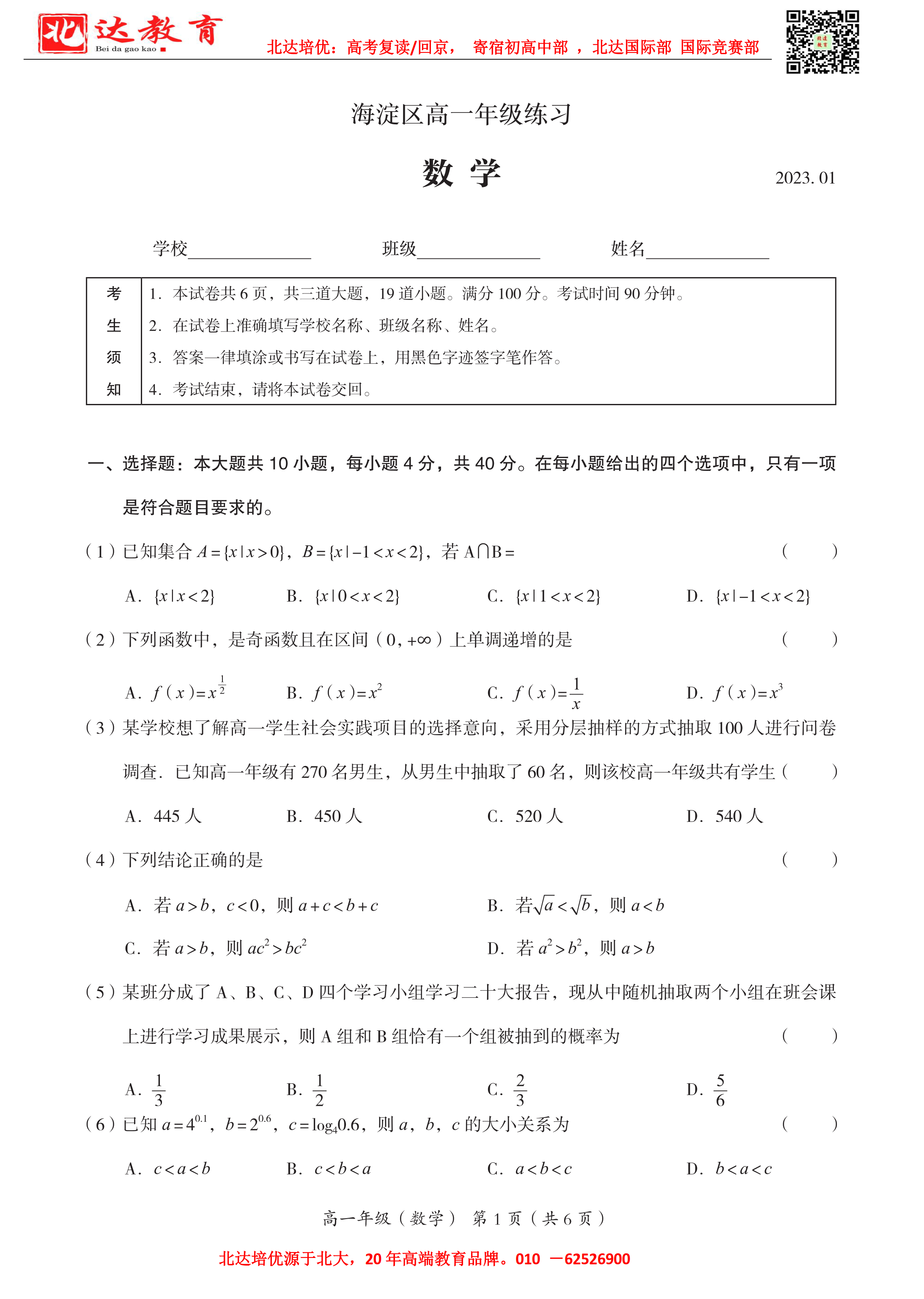 2023年北京海淀区高一上期末数学试题及答案,附高清电子版,欢迎为大家下载分享~