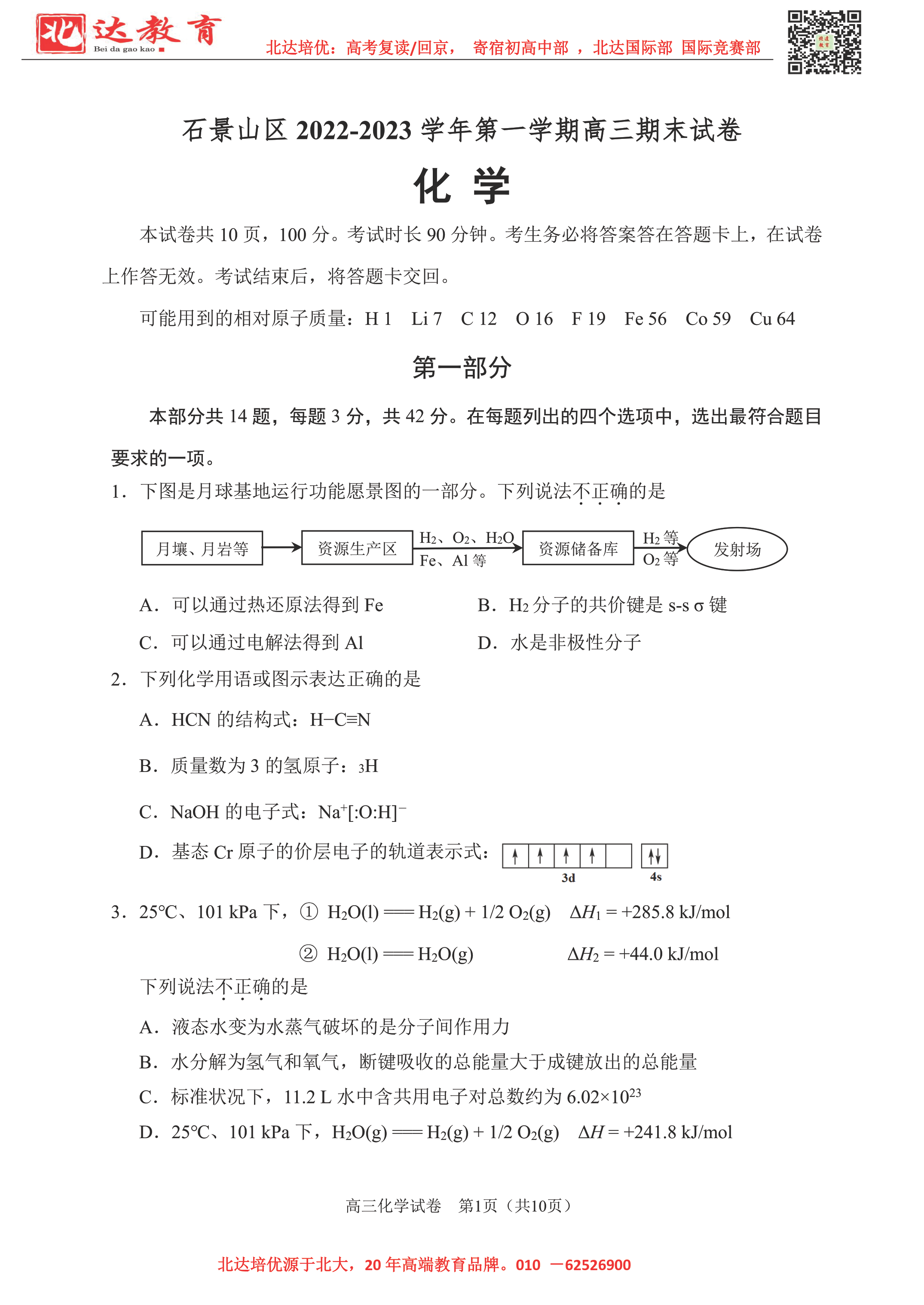 2023北京各区期末考试已陆续开始,为了方便同学们查找相关试题,admw360高考复读学校整理了2023年北京石景山区高三上学期期末化学试题及答案,附高清电子版,欢迎为大家下载分享~