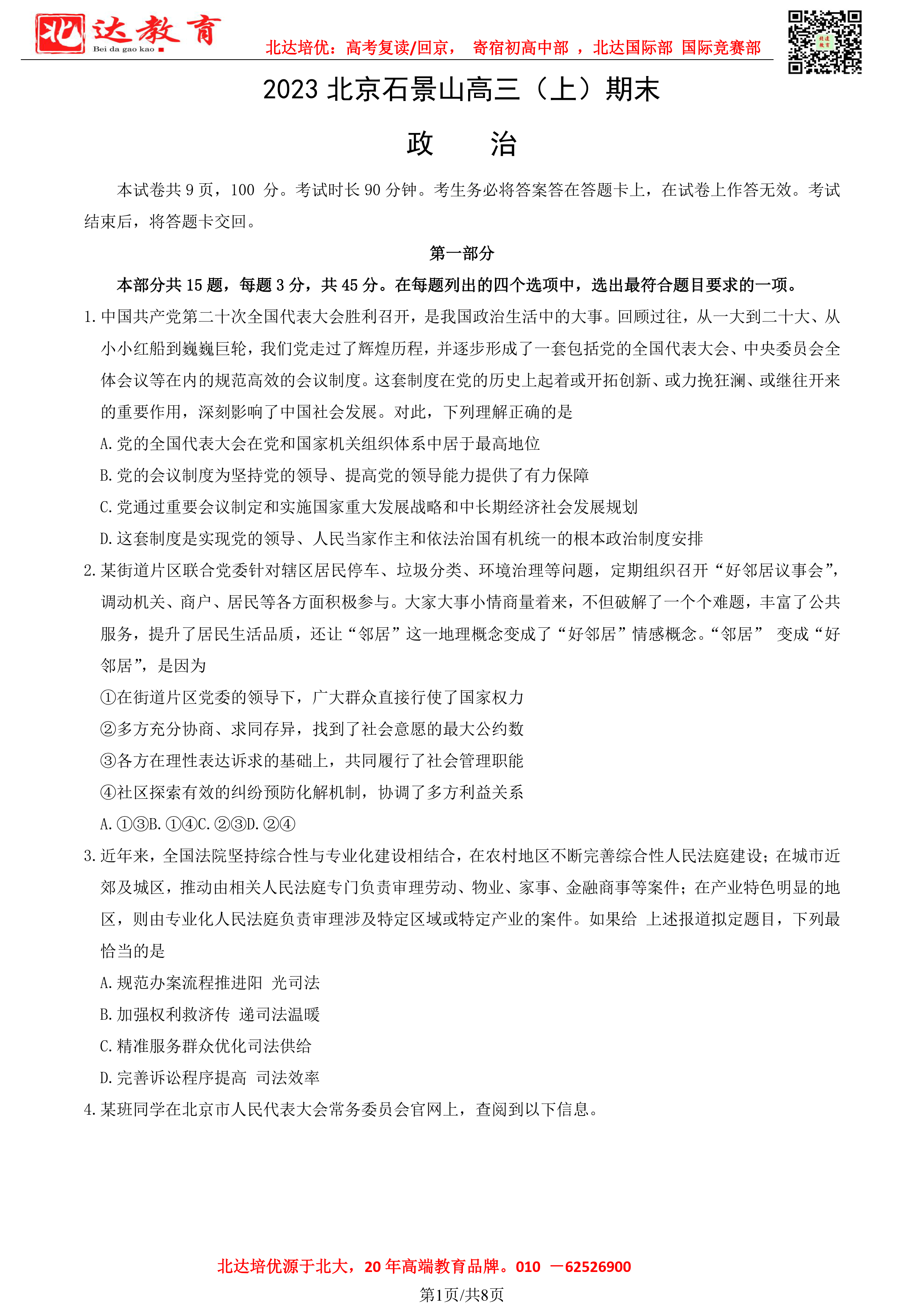 2023北京各区期末考试已陆续开始,为了方便同学们查找相关试题,admw360高考复读学校整理了2023年北京石景山区高三上学期期末政治试题及答案,附高清电子版,欢迎为大家下载分享~