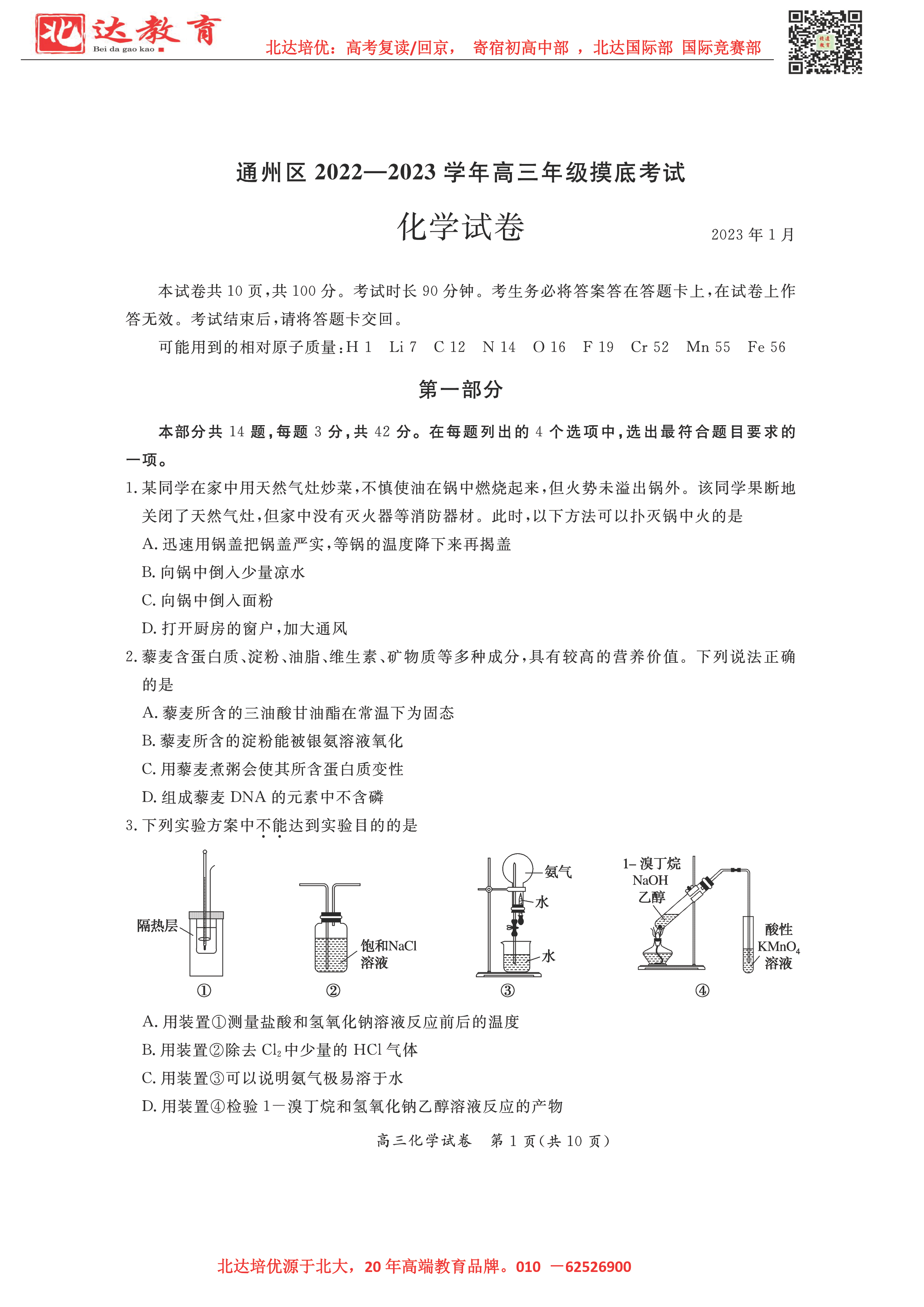 2023北京各区期末考试已陆续开始,为了方便同学们查找相关试题,admw360高考复读学校整理了2023年北京通州区高三上学期期末化学试题及答案,附高清电子版,欢迎为大家下载分享~