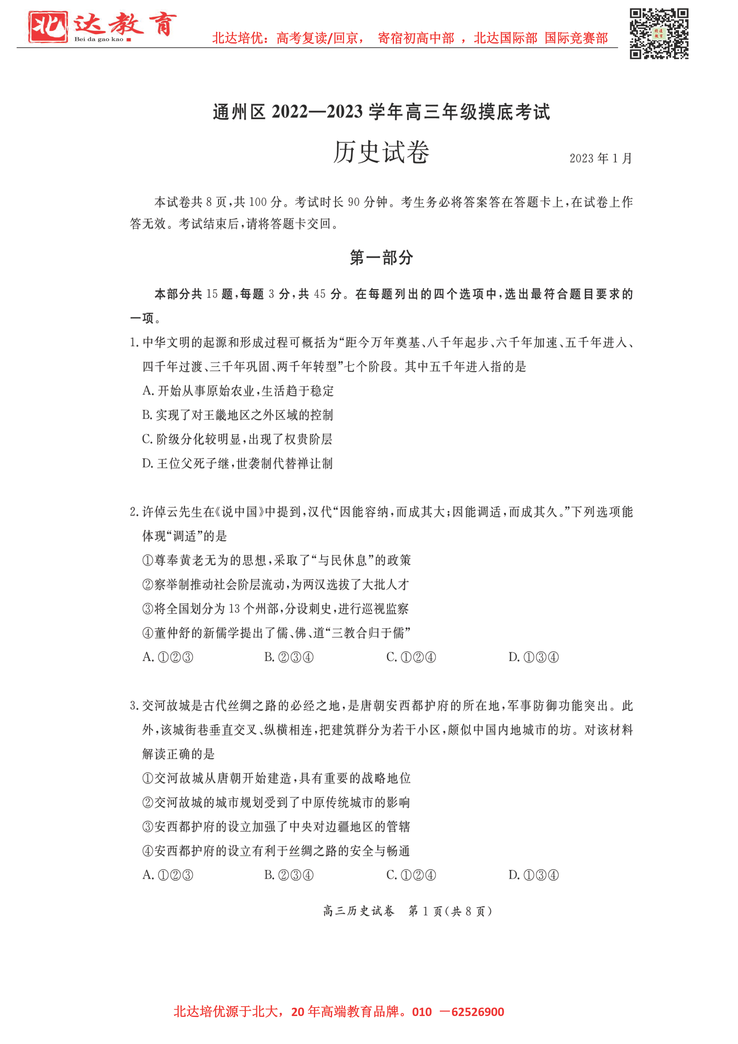 2023北京各区期末考试已陆续开始,为了方便同学们查找相关试题,admw360高考复读学校整理了2023年北京通州区高三上学期期末历史试题及答案,附高清电子版,欢迎为大家下载分享~