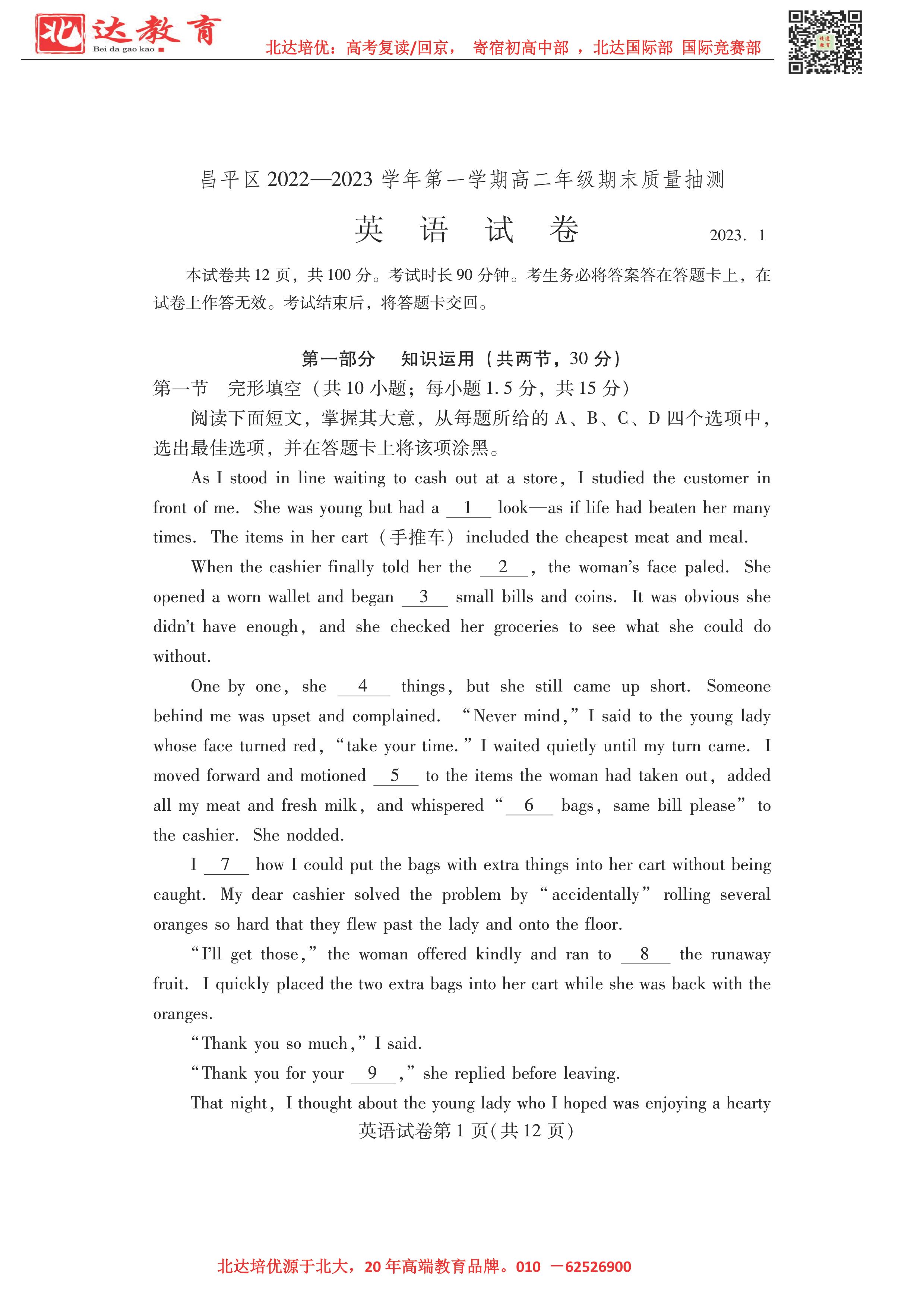 2023北京各区期末考试已陆续开始,为了方便同学们查找相关试题,admw360高考复读学校整理了2023年北京昌平区高二上学期期末英语试题及答案,附高清电子版,欢迎为大家下载分享~