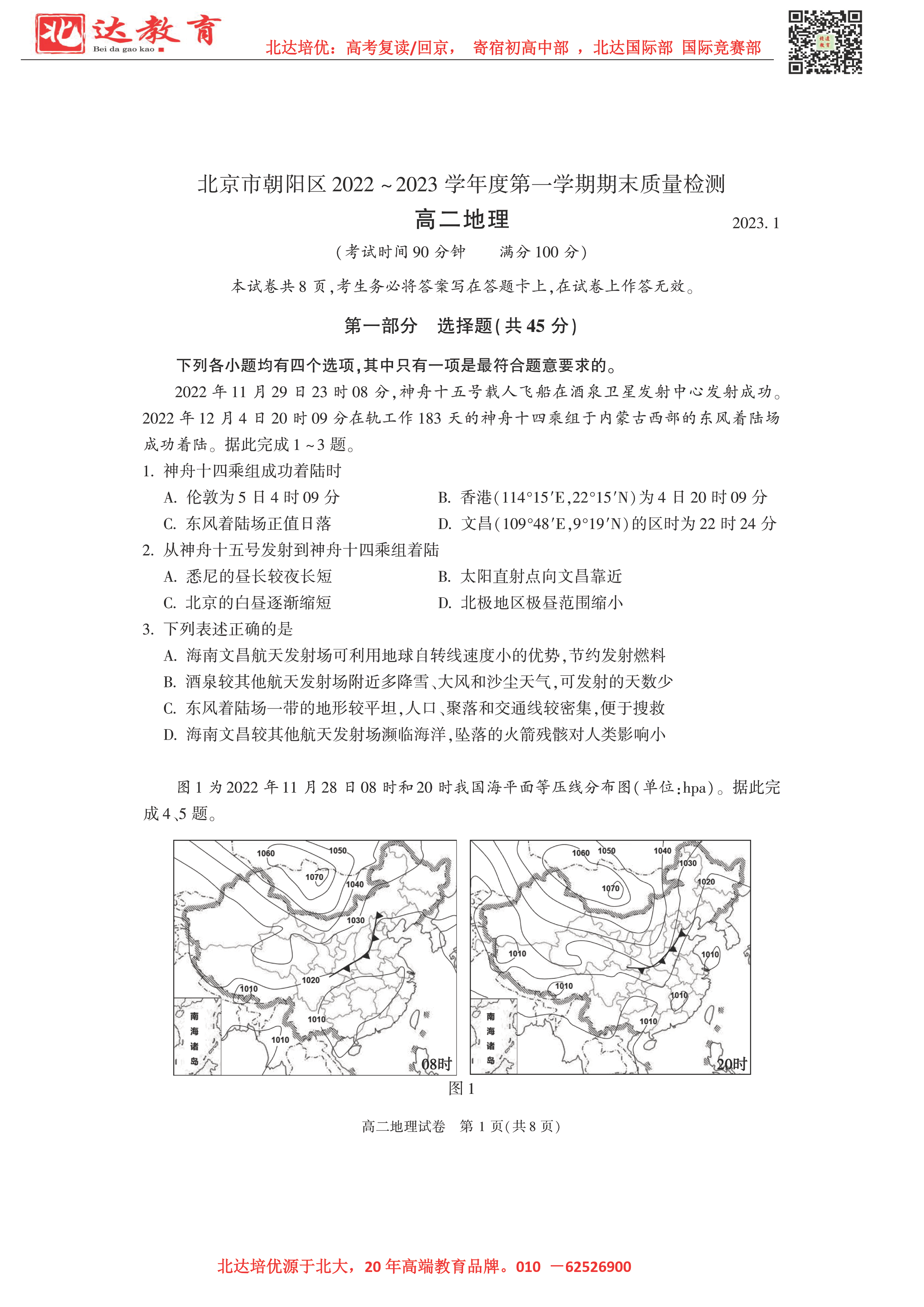2023北京各区期末考试已陆续开始,为了方便同学们查找相关试题,admw360高考复读学校整理了2023年北京朝阳区高二上学期期末地理试题及答案,附高清电子版,欢迎为大家下载分享~
