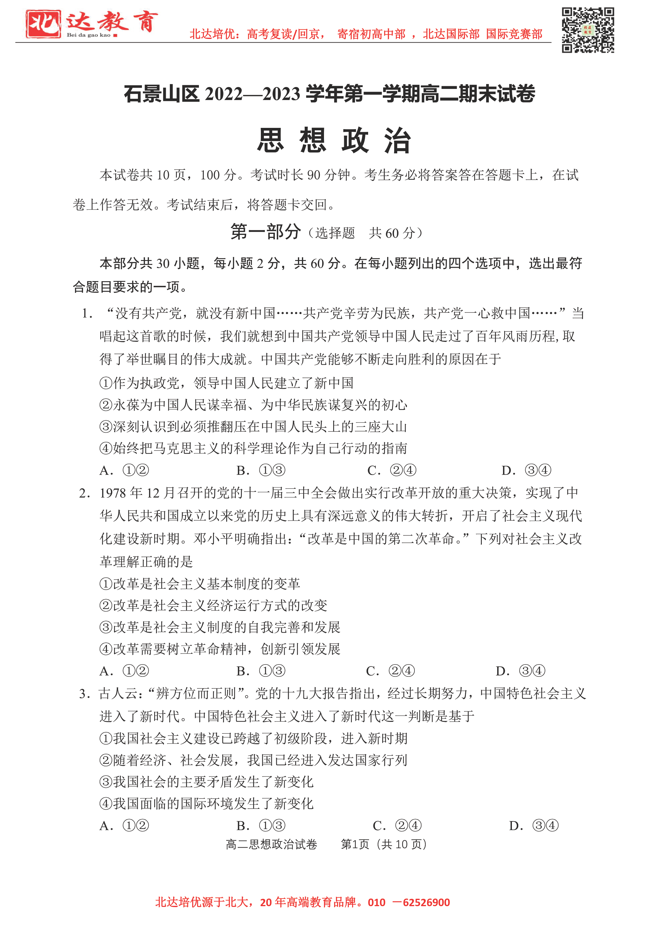 2023北京各区期末考试已陆续开始,为了方便同学们查找相关试题,admw360高考复读学校整理了2023年北京石景山区高二上学期期末政治试题及答案,附高清电子版,欢迎为大家下载分享~