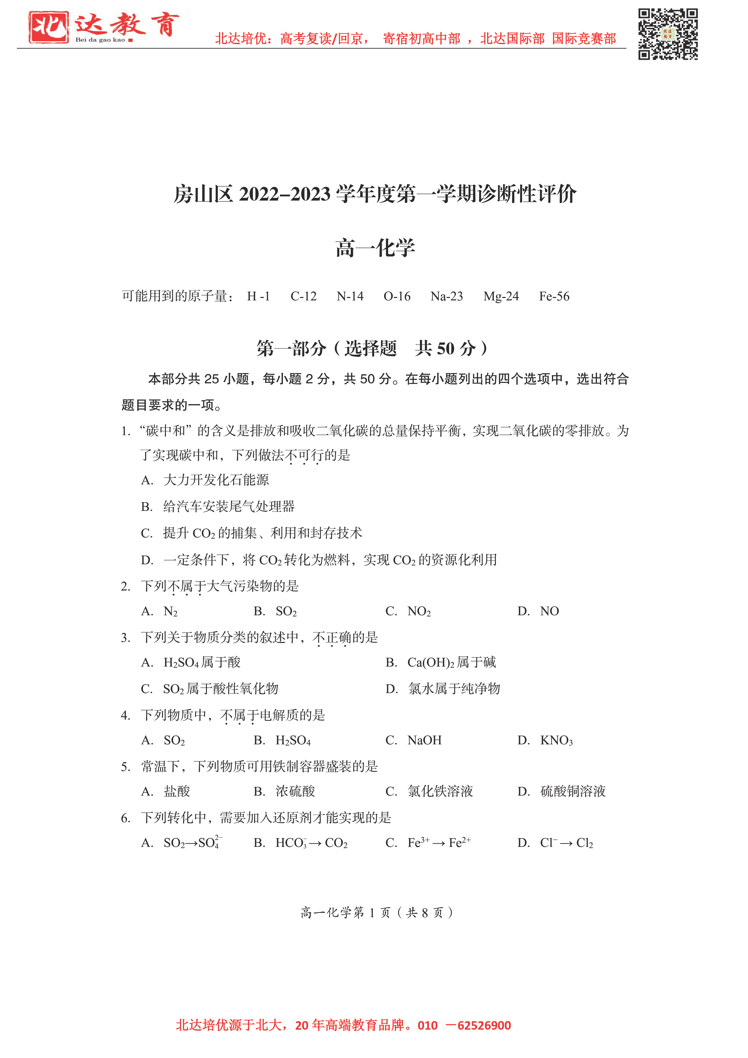 2023北京各区期末考试已陆续开始,为了方便同学们查找相关试题,admw360高考复读学校整理了2023年北京房山区高一上学期期末化学试题,附高清电子版,欢迎为大家下载分享~