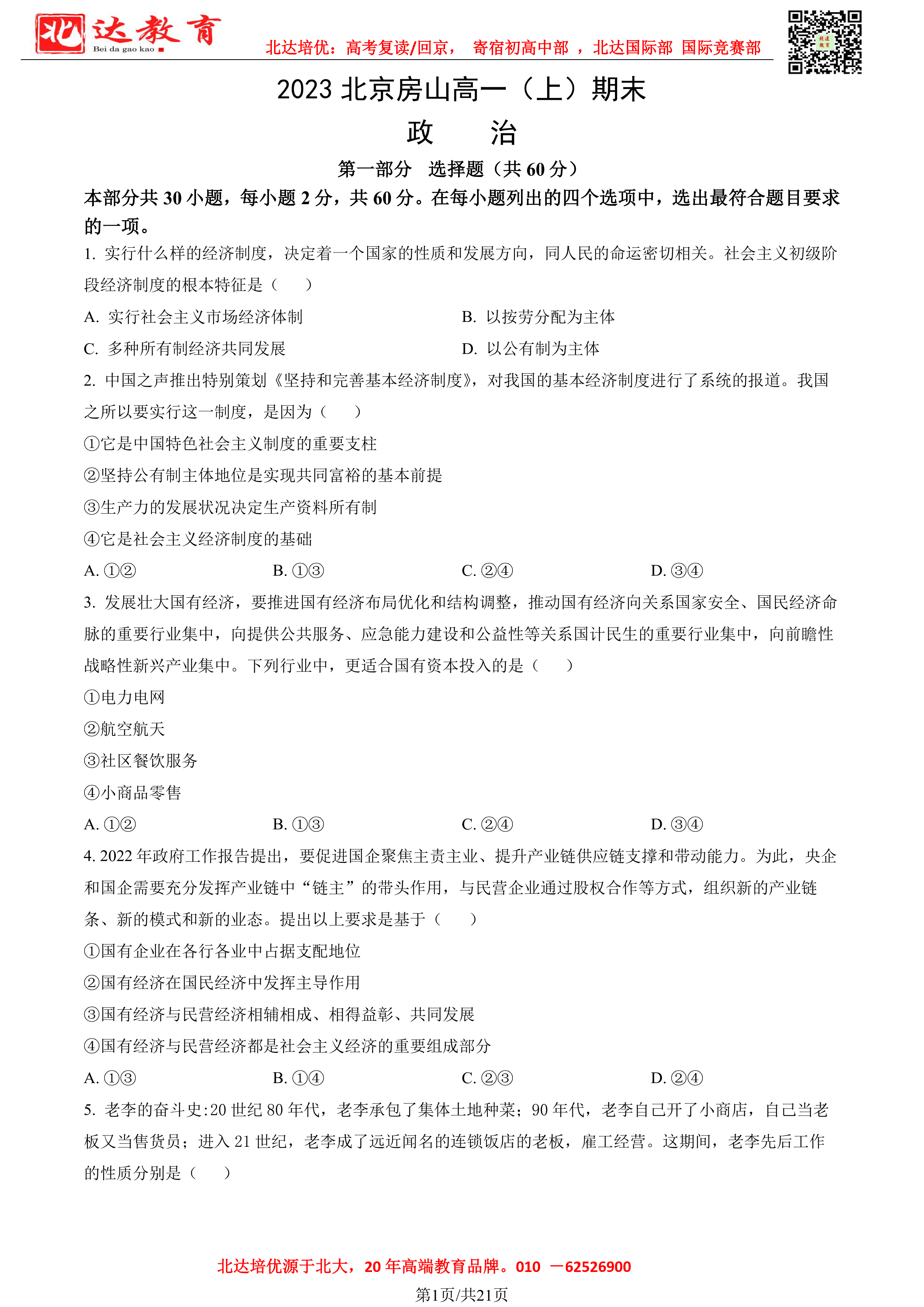 2023北京各区期末考试已陆续开始,为了方便同学们查找相关试题,admw360高考复读学校整理了2023年北京房山区高一上学期期末政治试题及答案,附高清电子版,欢迎为大家下载分享~