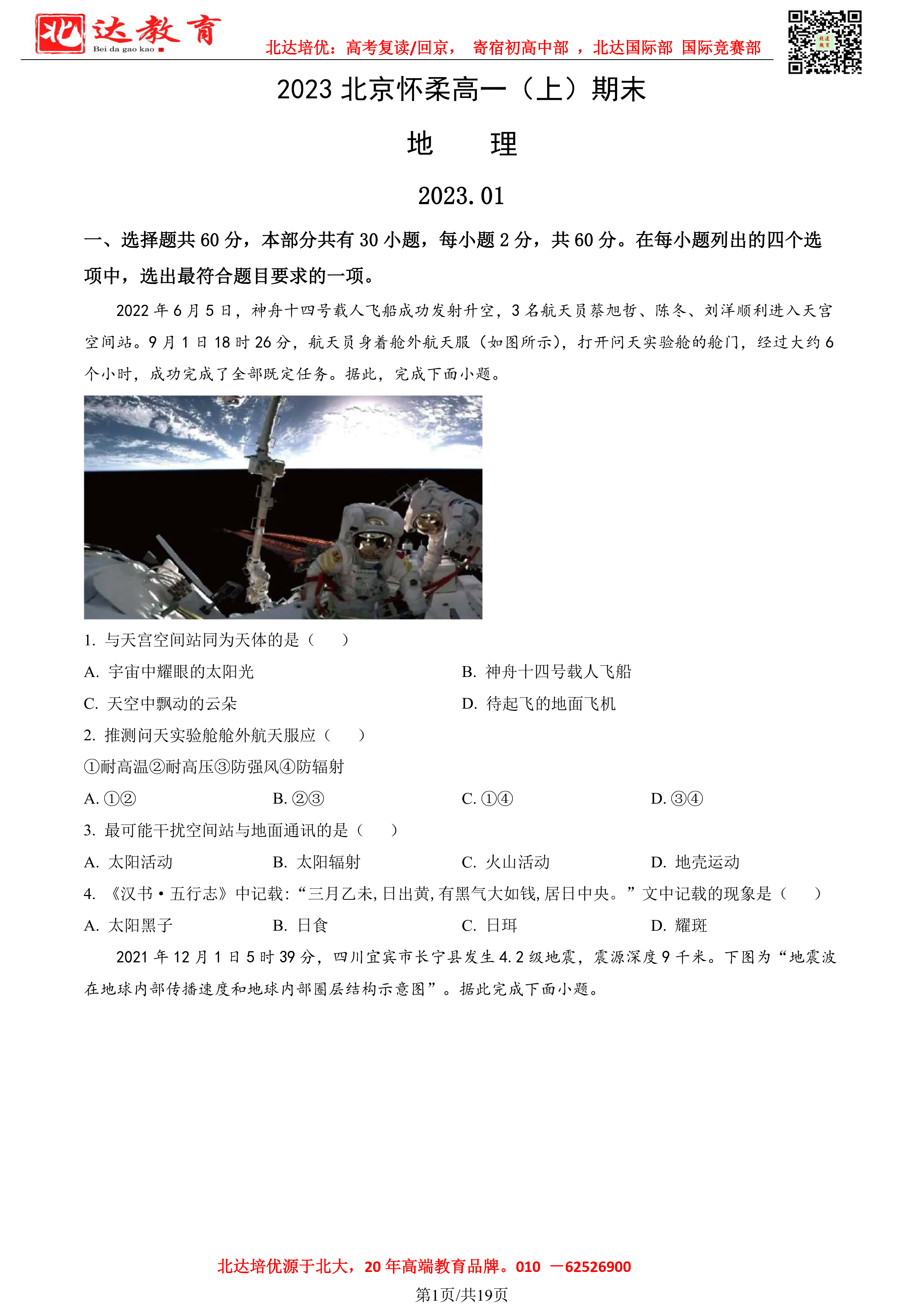 2023北京各区期末考试已陆续开始,为了方便同学们查找相关试题,admw360高考复读学校整理了2023年北京怀柔区高一上学期期末地理试题及答案,附高清电子版,欢迎为大家下载分享~