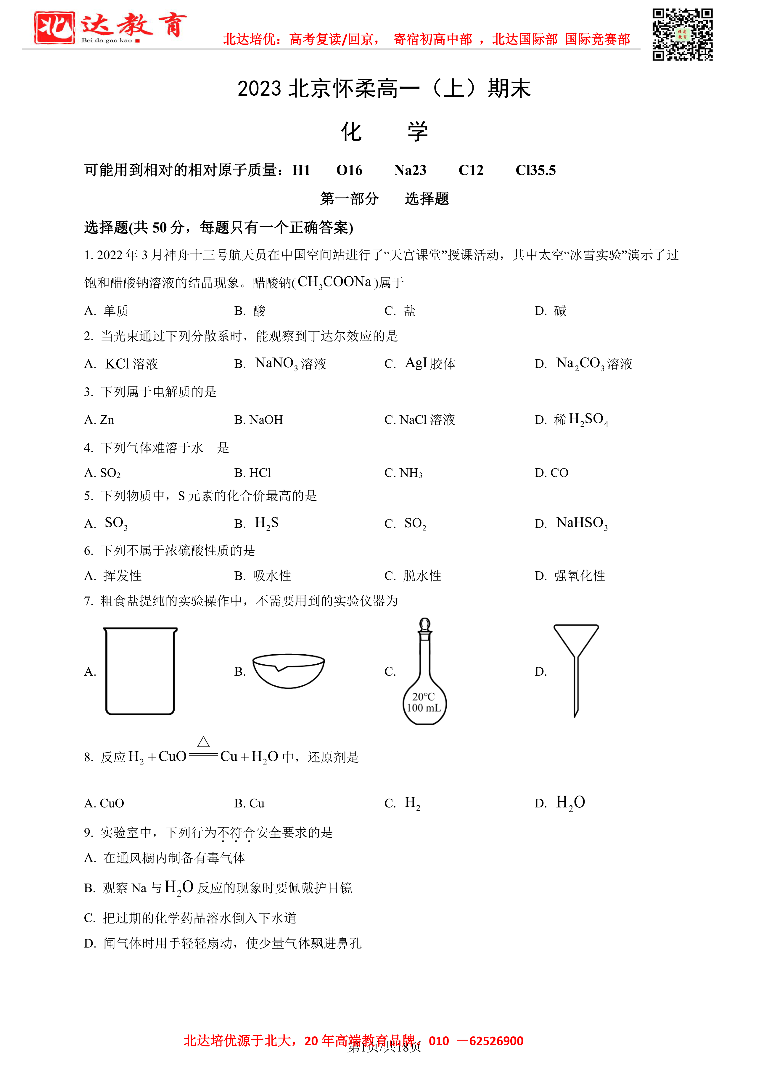 2023北京各区期末考试已陆续开始,为了方便同学们查找相关试题,admw360高考复读学校整理了2023年北京怀柔区高一上学期期末化学试题及答案,附高清电子版,欢迎为大家下载分享~