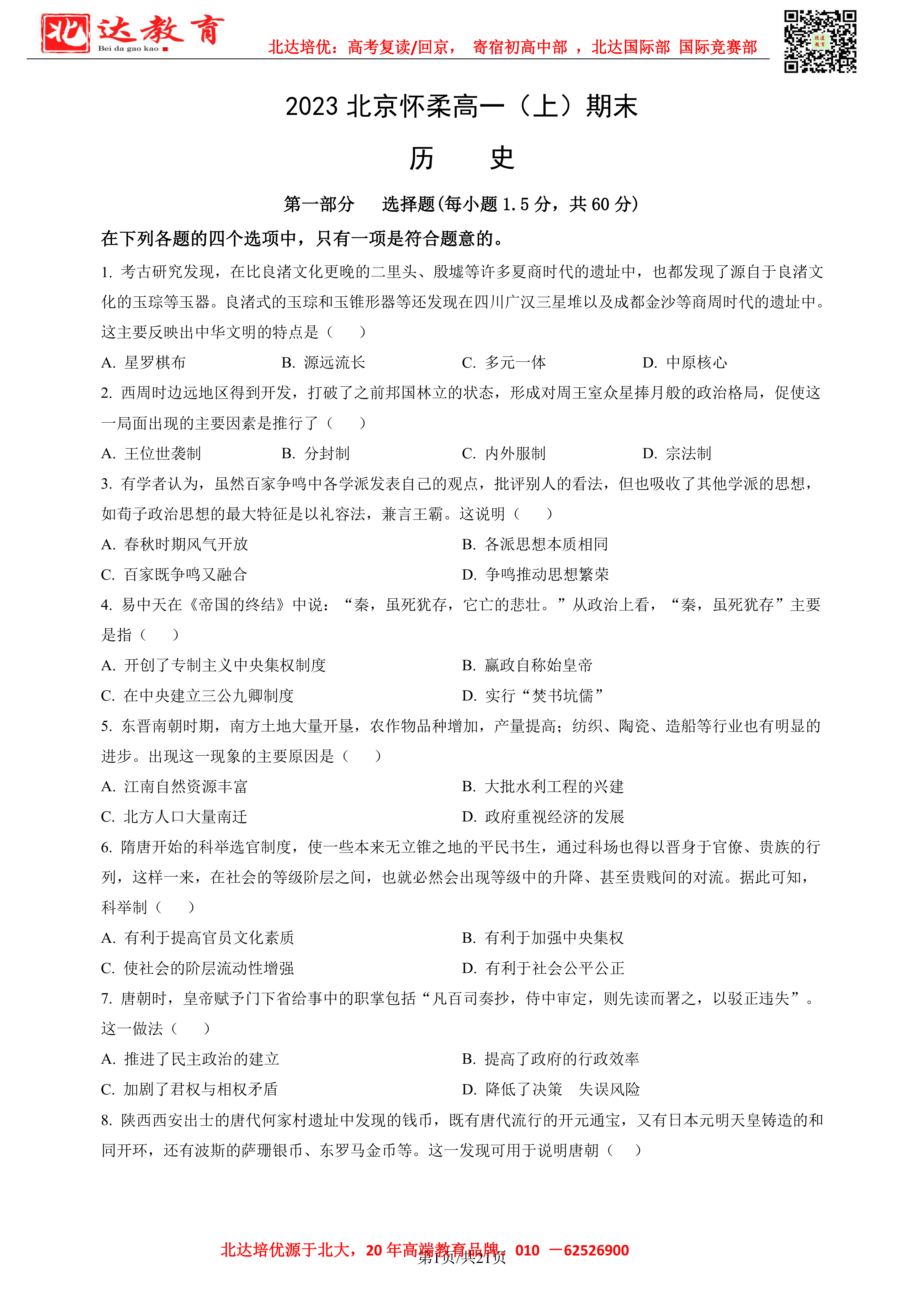 2023北京各区期末考试已陆续开始,为了方便同学们查找相关试题,admw360高考复读学校整理了2023年北京怀柔区高一上学期期末历史试题及答案,附高清电子版,欢迎为大家下载分享~