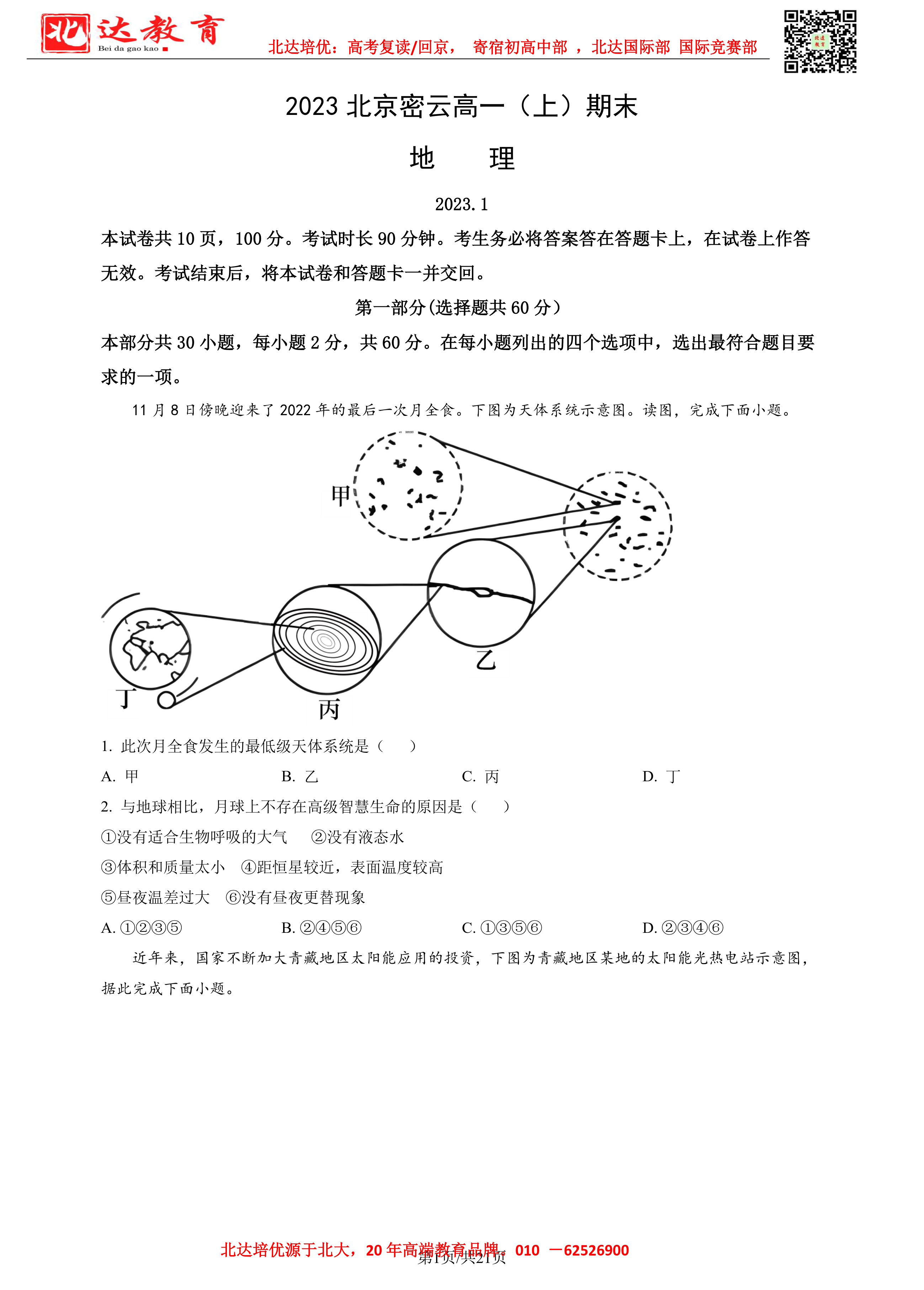 2023北京各区期末考试已陆续开始,为了方便同学们查找相关试题,admw360高考复读学校整理了2023年北京密云区高一上学期期末地理试题及答案,附高清电子版,欢迎为大家下载分享~